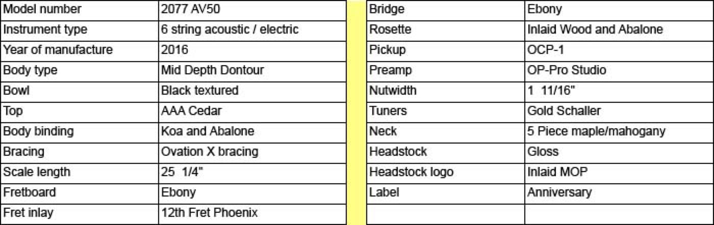 To celebrate their 50th anniversary, Ovation produced a very limited run based on their iconic Custom Legend model. This cutaway version carries along the legacy of the original model married with the latest in technologies and some special anniversary elements never before seen. The bowl is a slightly cutdown variation of the deep contour bowl matched to a AAA Cedar top trimmed in Koa and Abalone. Amplification is handled by the OP-Pro Studio preamp. The whole package is set off by a special 12th fret Phoenix inlay. Officially the model number is 2077-an50. My guitar below was obtained via Lost Art Vintage Instruments and is serial number 02 of 50.