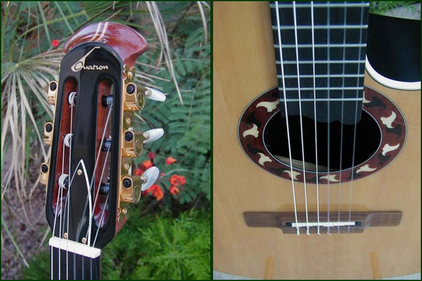 This is the second generation Country Artist. The concept was originally developed in the early 70's for an Artist depth bowl nylon strung guitar that would be different from traditional classicals in that it had a slightly narrower neck of 1-7/8 inch and attached to the body at the 14th fret. The original Country Artist can be found here. Shown below is the second generation Country Artist, model 6773. This guitar maintains many of the same features of the original but uses the mid-depth bowl in a cutaway design. The inlaid rosette is a beautiful intricate design of three wood types and a similar wood inlay is found at the 12th fret. The electronics consist of the wonderful OP-X pre-amp. The guitar shown below is a 1996 model which has had the headstock custom gloss finished and installation of gold Schaller tuners.