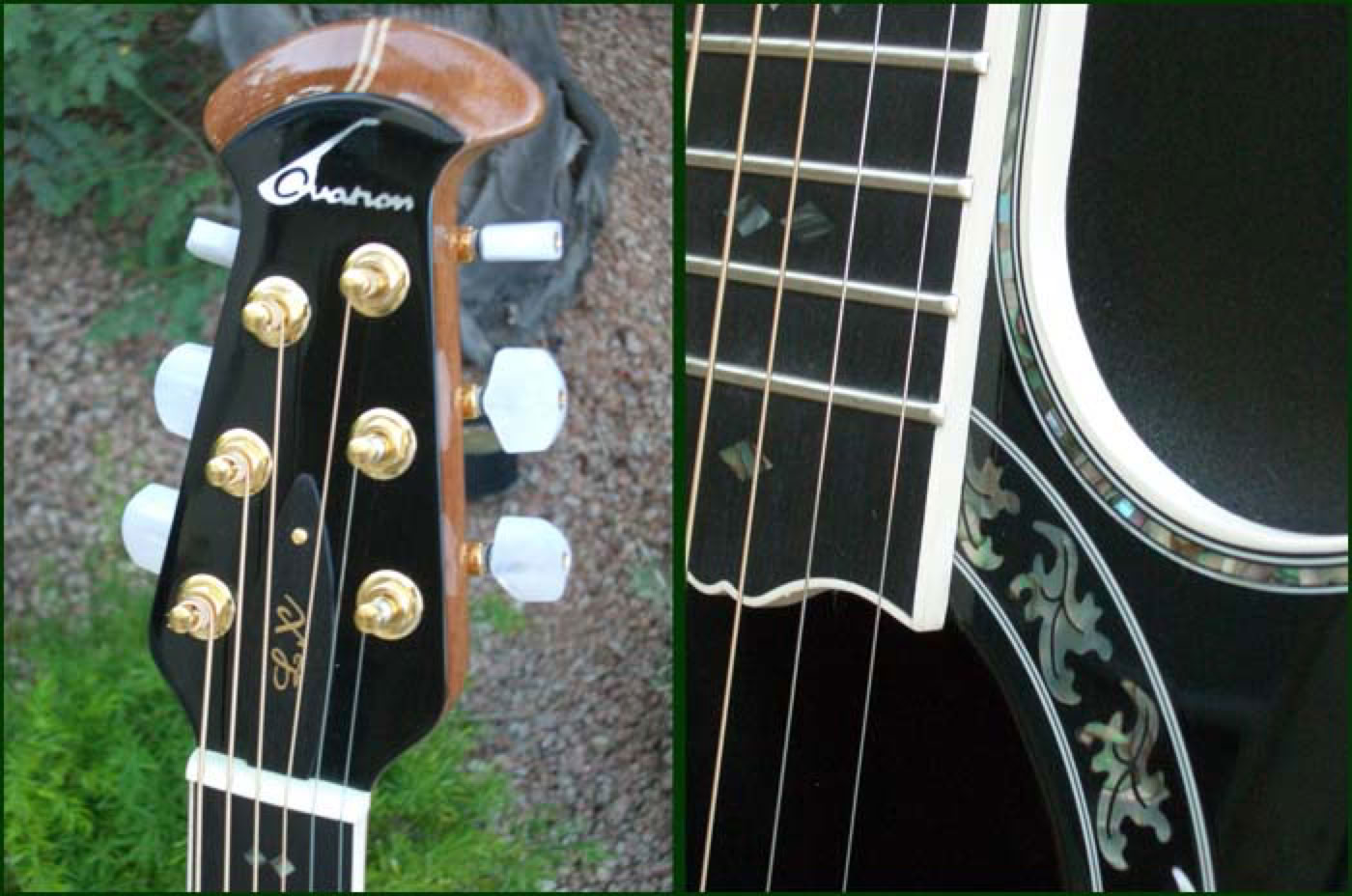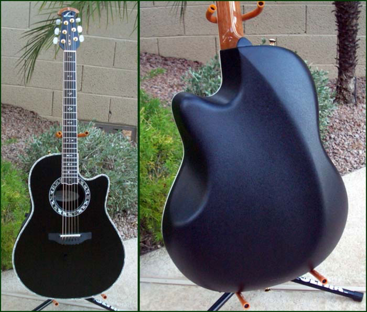 Following quickly on the success of the Contour Bowl introduced on the 2005 Collectors guitar, Ovation started offering in the summer of 2005 a Contour Bowl version of the Custom Legend LX. All other features are standard of the Custom Legend - select sitka spruce top, abalone body binding, 5 piece gloss neck, abalone fretboard inlays, OP-Pro preamp with XLR output, inlayed abalone rosette. But the model C2079, as shown below in gloss black, has the added benefit of the wonderful Contour Bowl. This innovative shape has all the benefits of the traditional lyrachord bowl, but has the added comfort of the new contoured shape. The Custom Legend LX Contour Bowl is currently the top model in the Ovation line and worthy of it.