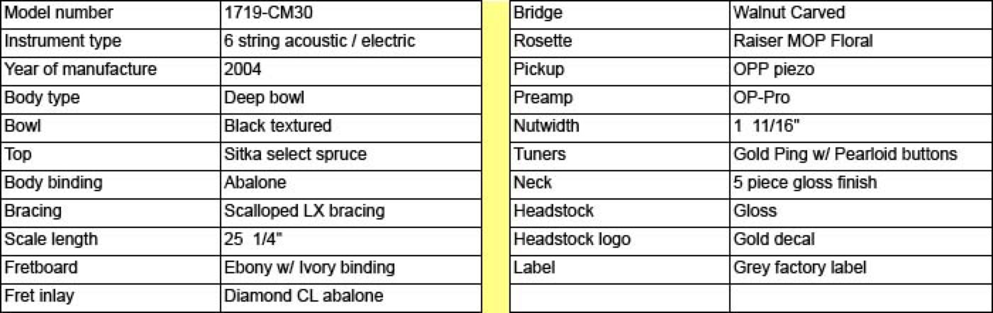 2004 marked the 30th anniversary of Ovations flagship model, the Custom Legend. Since 1974, the Custom Legend found its way into the hands of just about every prominent Ovation player including Glen Campbell, Paul McCartney, Al DiMeola and Paul Simon just to name a few. To celebrate the occasion, Ovation chose to produce this special 30th Anniversary model in limited quantity. But rather than do a full on re-issue of the original, they chose to expertly meld some of the latest available technologies (microsphere bowl, LX neck, OP-pro Studio electronics) with the original elements (A-braced top, abalone bound body, hand carved bridge, gold/pearloid tuners). What resulted was absolutely the best of both worlds and my guitar below continues to be a keepsake of my collection.