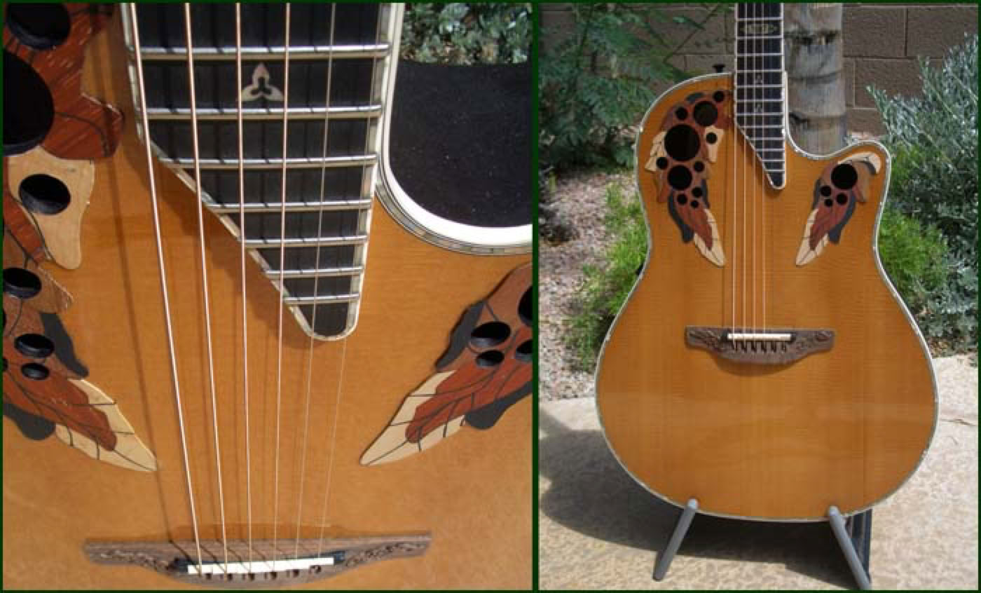 Shown below is the beautiful 1987 Collectors Guitar. Ovation had concentrated for several years on the new super-shallow bowl guitars but for 1987 made a return to their roots and designed a limited edition guitar with emphasis on acoustic sound. The 1987 Collector is a deep bowl elite style guitar with AAA spruce top and quintad bracing. The tone is simply stunning and goes down as one of the finest sounding guitars to be produced in New Hartford. But the 1987 Collector is also quite a looker. For the first time, Ovation applied the cosmetic touches of the Custom Legend to an Elite style guitar - abalone body trim, neck bound in abalone and carved walnut bridge. The 1987 goes down as probably the most sought after of all the Ovation Collectors Series.