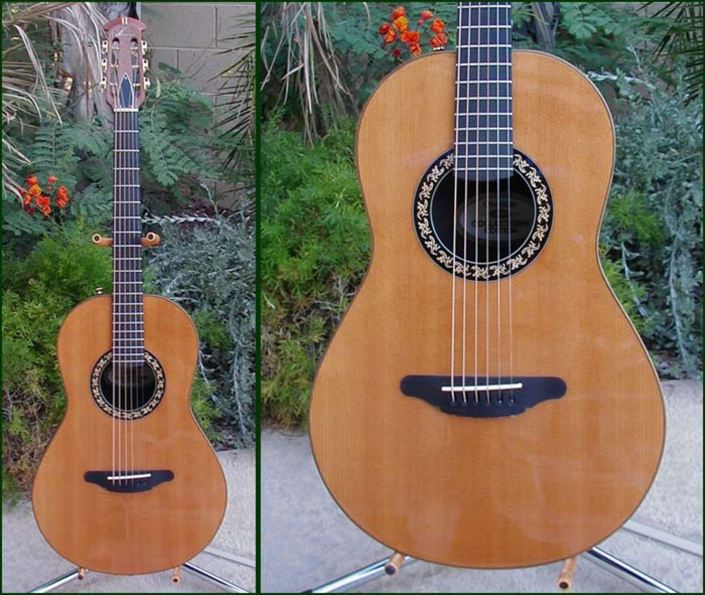 Of all the annual Collectors Series guitars introduced by Ovation since 1982, the 1997 offering is perhaps the most unique and daring. For the first time since the inception of the company, Ovation altered the body dimensions (in a drastic way) and introduced the Parlor Guitar. The Parlor size is smaller than a 000. This required the deign of a completely new bowl, new neck, and new top. The top is a beautifully finished aged toner on solid spruce bound in maple. The center sound hole rosette is also made of individual pieces of maple set in ebony. The slothead neck attaches at the 12th fret. On this model Ovation also introduced a completely new electronics system, comprised of a slimline pickup and the TS (Touch Sensitive) volume control. The TS is build into the top waist of the bowl as a series of touch sensitive bars. Output is though the endpin. The small Parlor body makes this an extremely comfortable guitar to play and the acoustic sound is surprisingly good for its size.