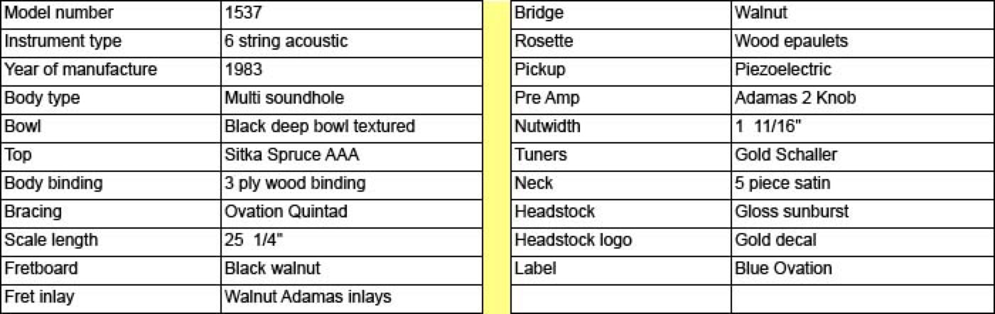 Soon after Ovation introduced the Adamas composite-fiber topped guitar, the obvious question was - could the multi-soundhole design and bracing pattern be implemented on a wood topped guitar? The answer from the engineering department was the model 1537 shown below in sunburst finish. Originally call the "Wood Topped Adamas", it went to market as the first model called the "Elite". The Elite shared the quintad bracing, multi-soundhole design and wooden epaulets of the Adamas combined with a traditional gloss Ovation neck, headstock and gold Schaller tuners. The fretboard was black walnut with maple inlays. The select spruce top and body was also bound in wood inlay and housed the same 2-knob electronics as the Adamas. The Elite 1537 is not as loud or projecting as it's composite-fiber topped brother, but rather has a very mellow and "woody" sound. It is perhaps the closest Ovation has ever come to copying the sound of their wooden-box competitors. The Elite 1537 was only produced for a few short years, which makes it a very sought after guitar for collectors and players alike.