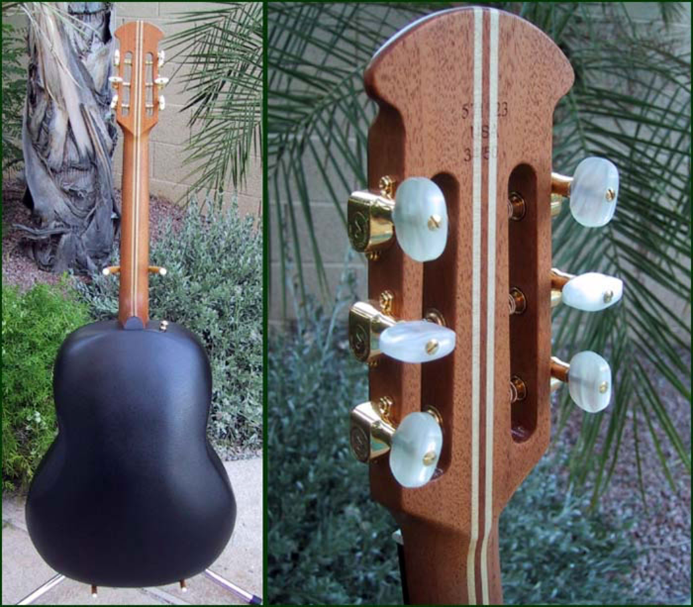The Ovation Folklore Deluxe, model FD-14, is perhaps the best sounding acoustic guitar that New Hartford has ever produced. That's a bold statement to be sure. But I've played this wonderful limited edition next to Shiny Bowls, Adamas, Elites, and Custom Legend and each time I come away amazed. In 2003 the boys at Ovation set out to build an acoustic players guitar modeled after the original Josh White (and later the Folklore). What resulted was a limited run of 50 instruments from a very different mold. The body is a deep bowl, non-cutaway trimmed in inlaid walnut and tortoise shell. The sound hole rosette is also of a beautiful hand laid walnut and tortoise shell. The 12 fret neck is a slightly narrower version of the original (1-3/4"), yet still wider than the standard steel string guitars. The soundboard is a satin finished cedar, which has an amazing woody mellowness to it. Topping it off is a wonderful slotted headstock, which I've had gloss finished and adorned with the Josh White signature in honor of the original. A fixed EQ on-board pre-amp feeds the direct out to the endpin jack.