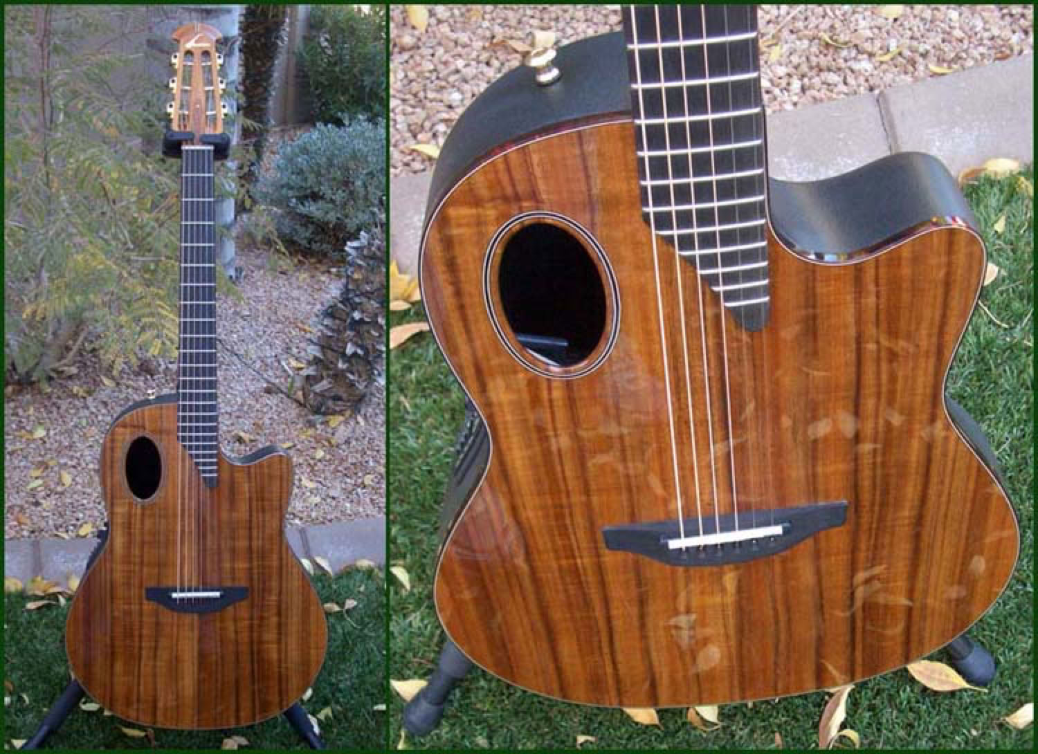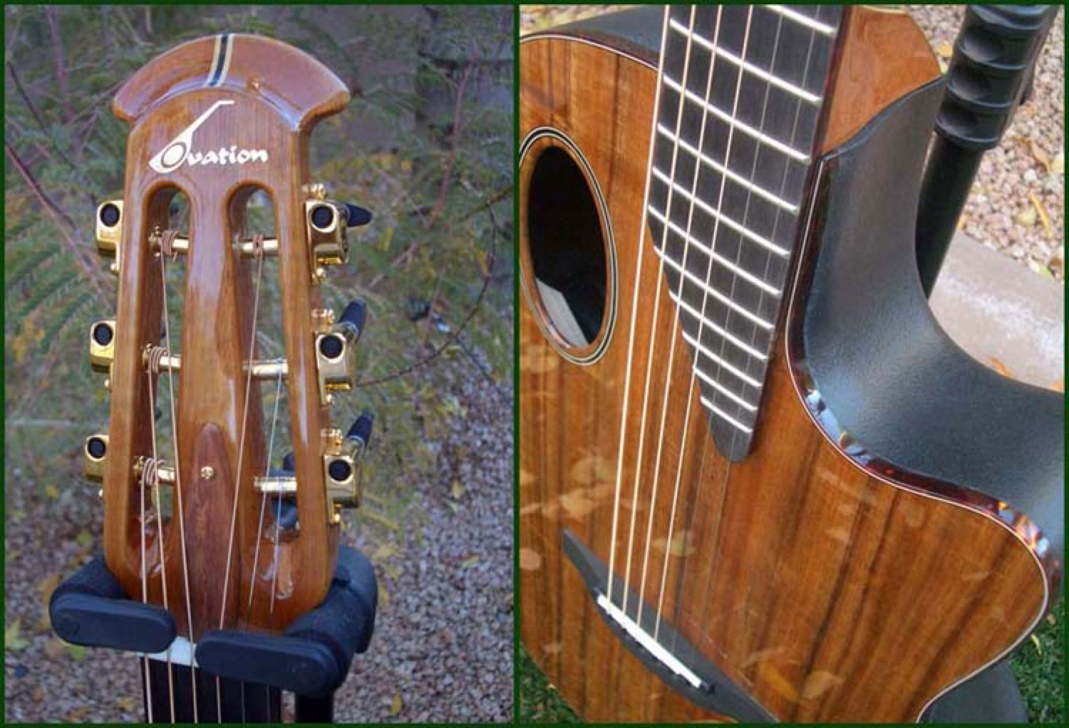 In early 2007, Lost Art Vintage Instruments of Bellmawr NJ built a limited run of 12 Koa topped guitars. These rare guitars were built based on a prototype of the previous year. The most notable characteristics of this instrument are of course the koa top and the unique sound hole. Ovation has experimented for years with alternative soundhole design and placement, and this offset design trimmed in tortoise shell provides for a unique voicing of this instrument. Louder, deeper and clearer than you would normally expect from a koa topped guitar. The same tortoise shell trim is applied to the body edge binding and fretboard binding. The bowl is the Contour design and electronics feature the new VIP-5 image modeling system.