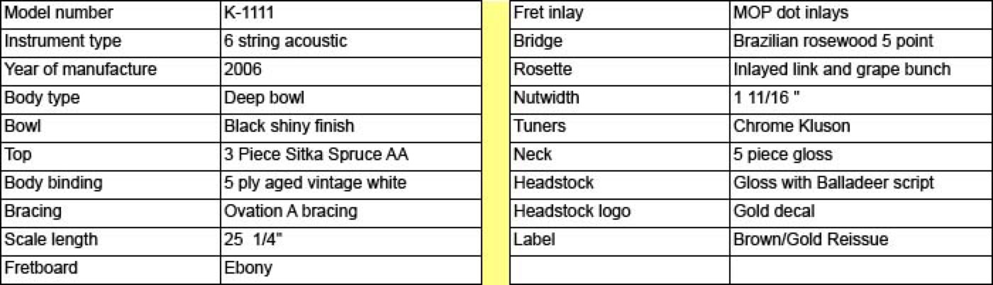 2006 marked the 40th anniversary of Ovation guitars. To commemorate this occasion, Ovation produced a very limited number of four vintage models that helped shape the company. The original shiny bowl models K-1111 Balladeer and K-1114 Josh White. And the popular early 70's models the 1618-1 Pacemaker A/E 12-string and the 1627-4 Glen Campbell Artist Balladeer. These models were built with the same materials and construction techniques as the originals. Shown below is my model K-1111 Balladeer reissue. I've owned several of the originals and I can attest that this is a very fine recreation. This guitars features the shiny fiberglass cloth bowl, 3 piece spruce top, 5 point Brazilian rosewood bridge, enclosed Kluson vintage tuners and the inlayed chainlink rosette. The attention to detail of the recreation is stunning, right down to the shape of the thick lip headstock and script model name logo. The sound and playability is everything that put the company on the map so many years ago. This guitar is serial number 02 of the reissue run.