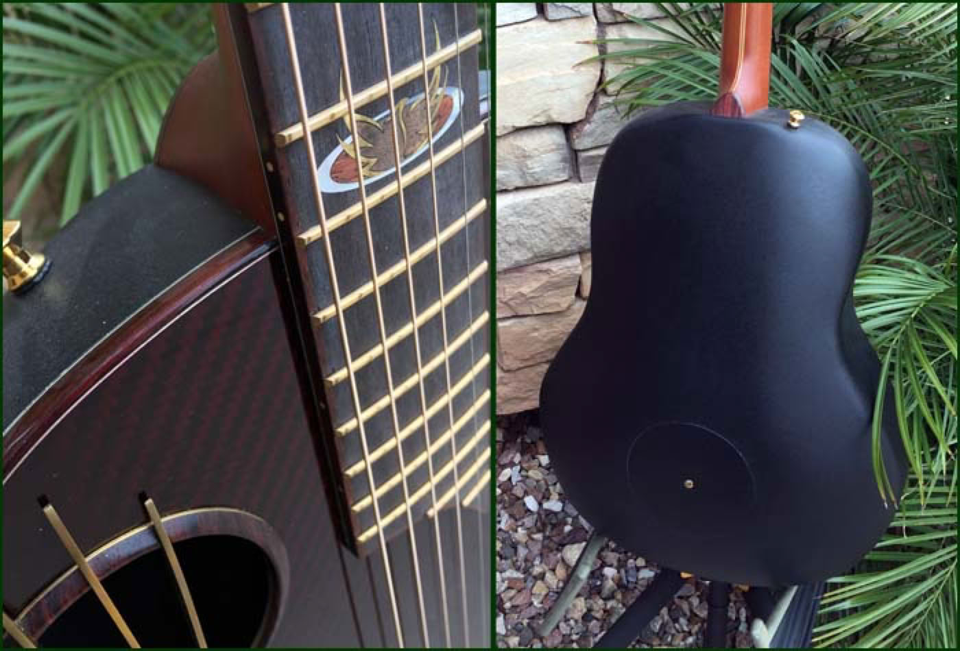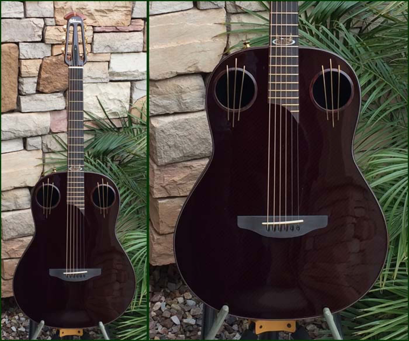2016 marked the 40th anniversary of the Adamas guitar. Introduced in 1976, the carbon fiber topped Adamas literally reset the standard by which all previous and future Ovation guitars would be judged. To celebrate the 40th anniversary Ovation produced a limited number of Adamas guitars in a unique configuration which incorporated both historical as well as newly developed technologies. Most notably the dual sound holes are adorned with the three bars (aka “Bearclaw”) that were seen on some early Adamas prototypes. The neck is a 12 fret 1-3/4 nutwidth similar to what had been the U681 model with slotted headstock. And the fretboard features a unique “Phoenix” inlay which some believe depicts the brand rising from the ashes. My guitar shown below is s/n 02 of the limited run, which I was fortunate to be able to order through Lost Art Vintage Instruments to include custom Waverly gold tuners to further setoff the beautiful slotted headstock.