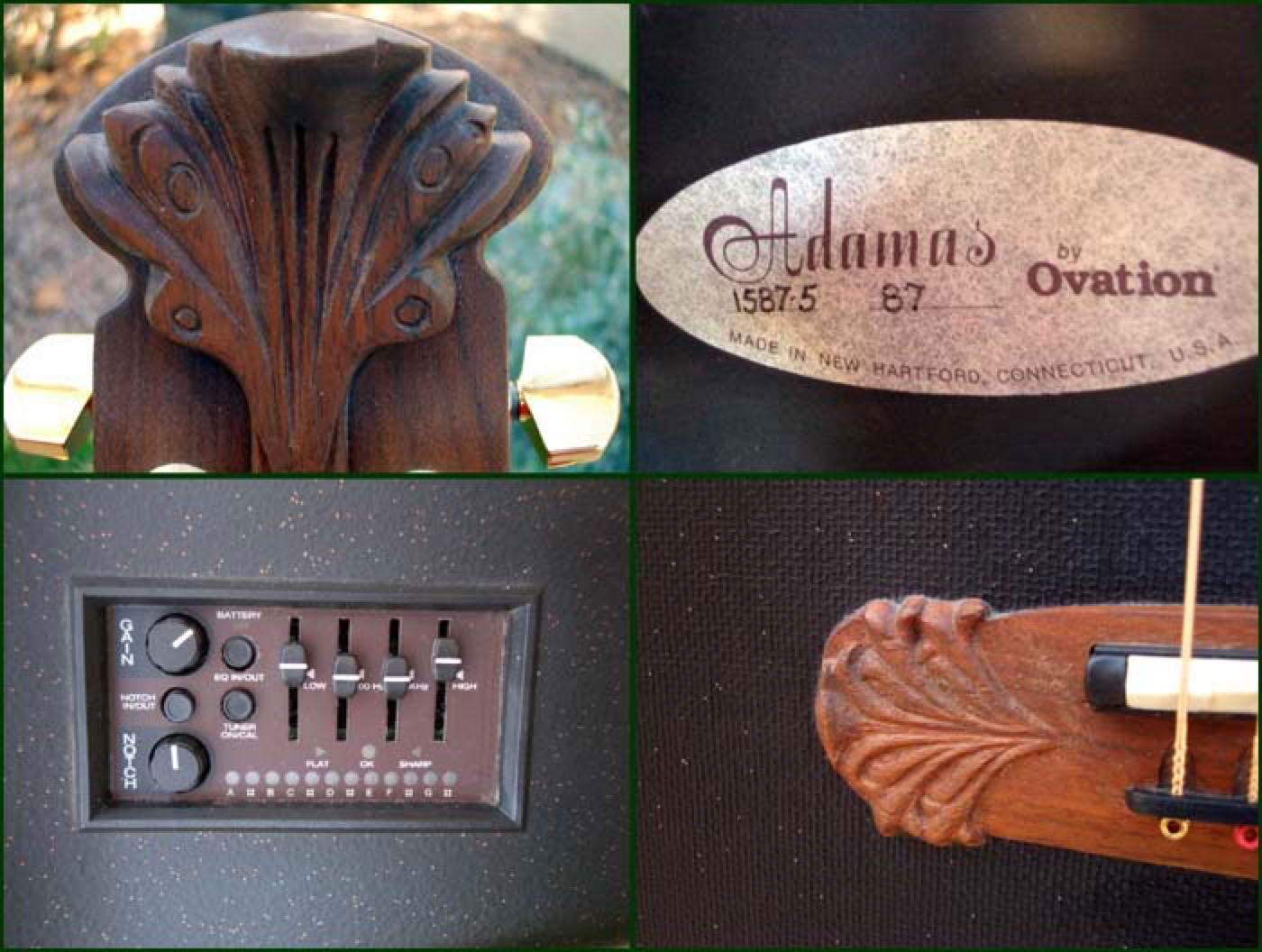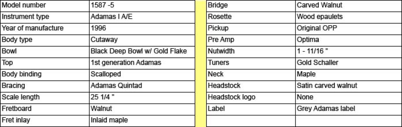 This model 1587 is an Adamas I cutaway manufactured in 1996. The deep bowl cutaways are somewhat rare and are known for their booming sound and crystal clear projection. This Adamas features the black finish textured top and carved bridge and headstock. Neck and fretboard are walnut with wooden inlays. Gold Schaller tuners and a standard 1-11/16 neck. Electronics are handled by the Optima pre-amp system. This is one of the best playing and best sounding Adamas guitars I have ever owned.