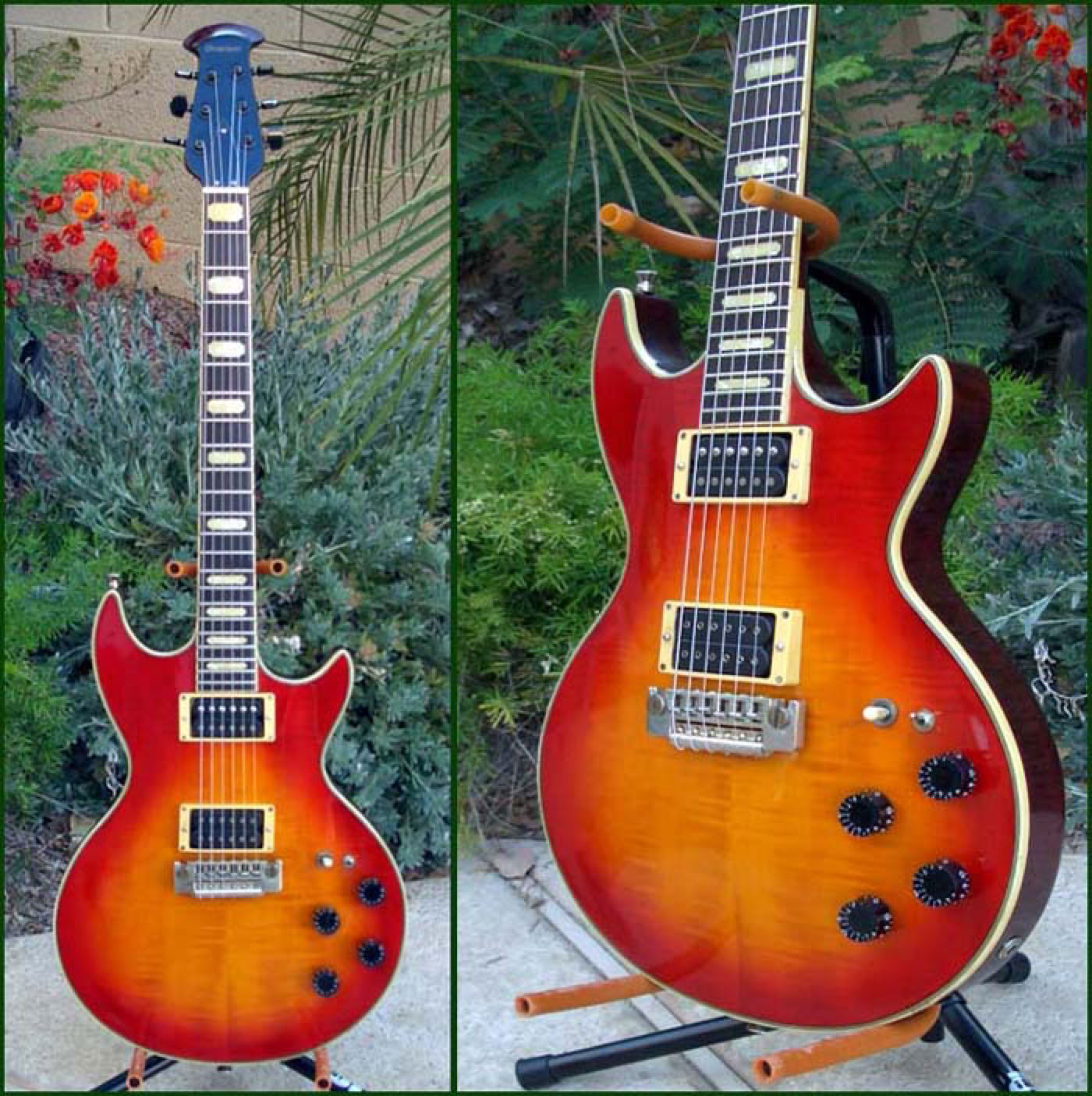 The Ovation Ultra GP 1431 was part of the short-lived "hardbody" series of guitars. This was Ovations third foray into the solidbody market. The GP was designed to be a competitor to the Les Paul (The name GP means Guitar Paul). There is also a GS and guess what that one stands for. The GP features a heavy hardwood body and set neck, topped with a beautiful rosewood fingerboard and large block inlay. The hardware is top notch with Schaller parts and a screaming pair of DiMarzio Super 2 pckups wired to twin volume and tone controls with a 3 way selector. The guitar plays great and has incredible sustain. The tops got some of the best color finishes that Ovation ever put out on solidbodies - gloss black, sunburst, wine red and honeyburst (pictured below). Despite how nice this guitar was, it never found much commercial success and the line was discontinued after only a few years. Rumors are that production numbers were only a few hundred or so, making it one of the more rare Ovations. In the mid 90's a popular heavy metal band started using the GP and this has brought some renewed interest to this rare guitar and has also driven up prices. Overall, this was probably Ovations best ever solidbody offering.