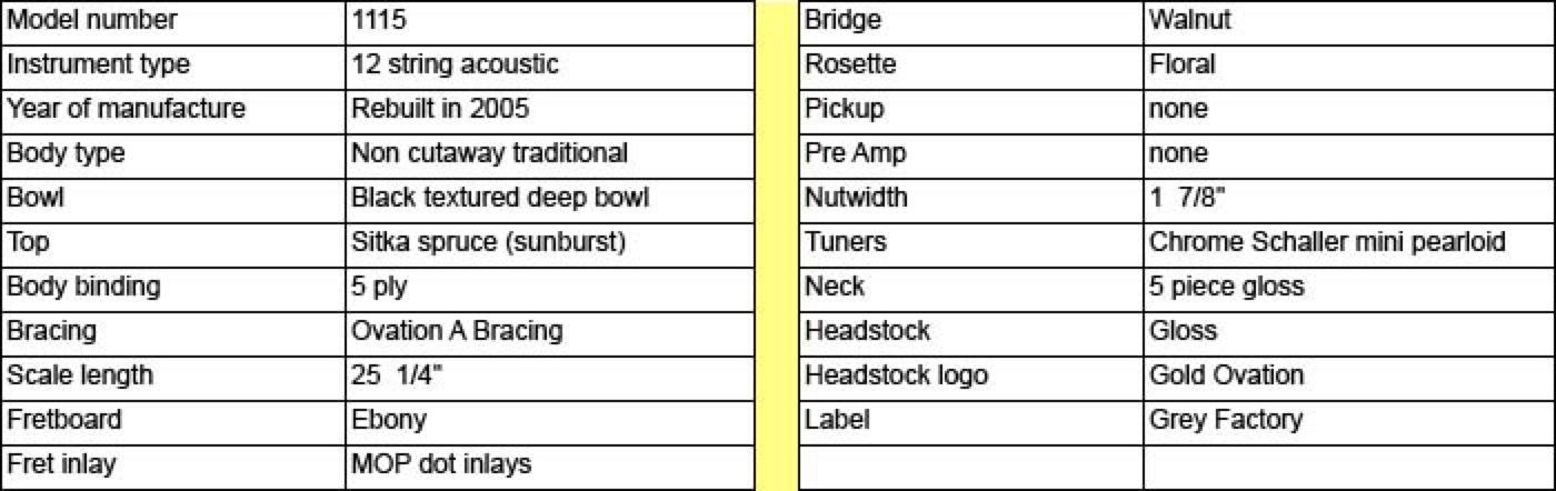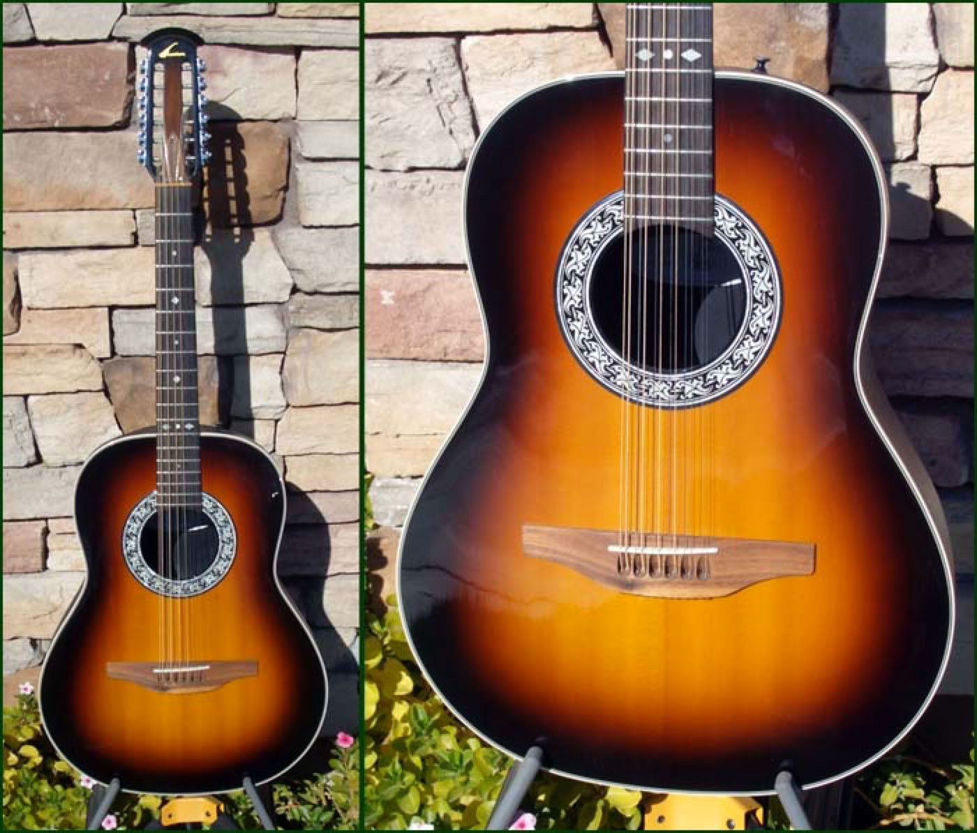 The deep bowl 12-string guitar has been a staple of Ovation's line since the very beginning. One of the most popular models is the Pacemaker, first introduced in 1970. This guitar features a 12-string slotted headstock, 12 fret neck attachment, 1-7/8 nut width and Ovations legendary sound and playability. My guitar shown below started life as a mid 70's model which became damaged (almost) beyond repair. It was returned to the Ovation factory in 2006 where it received an entirely new body, consisting of new lightweight deep bowl and an A-Braced sitka spruce top. The A bracing makes a significant tonal improvement over the original fan style bracing and this new/old guitar absolutely sings. Visually one of the very best Ovation sunburst finishes I have ever seen and the setup and playability is world class. Acoustic only.