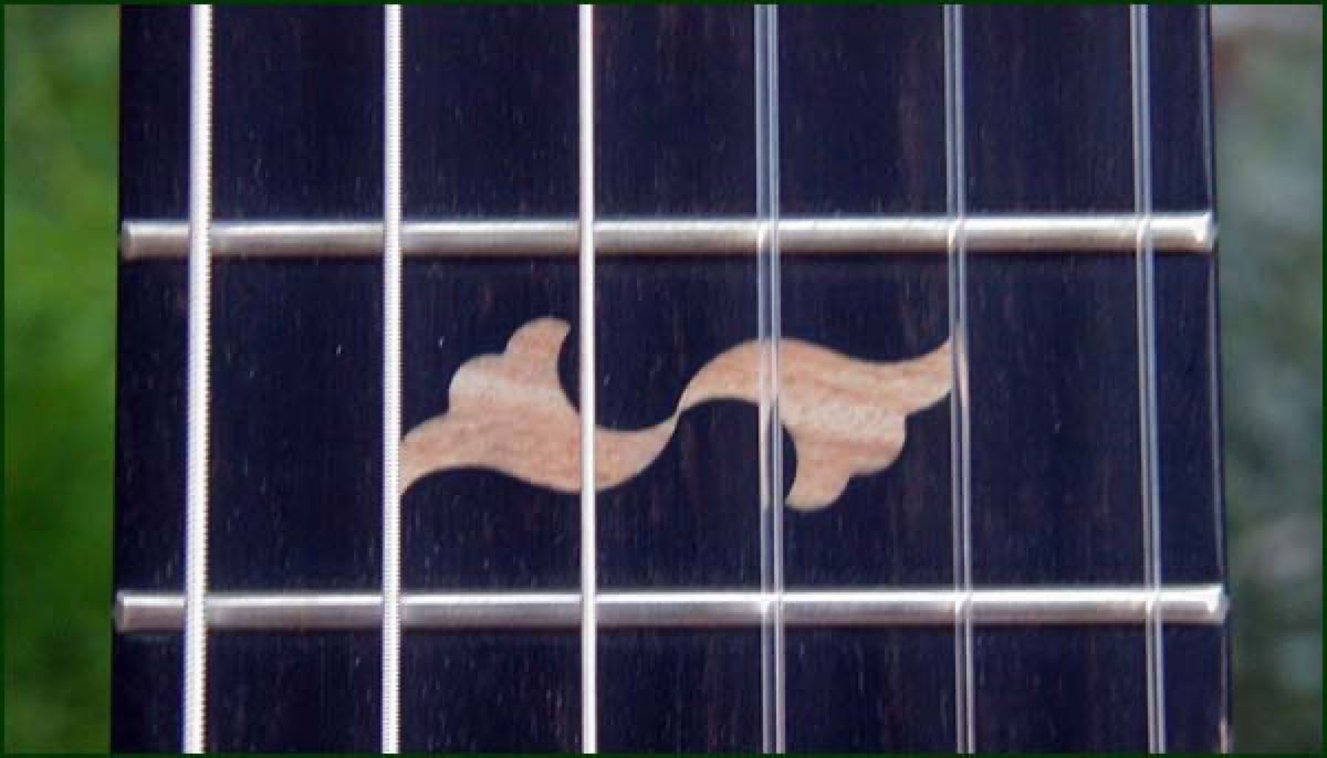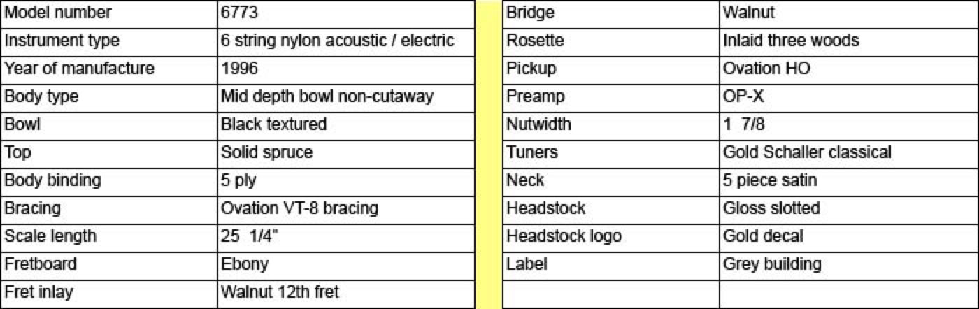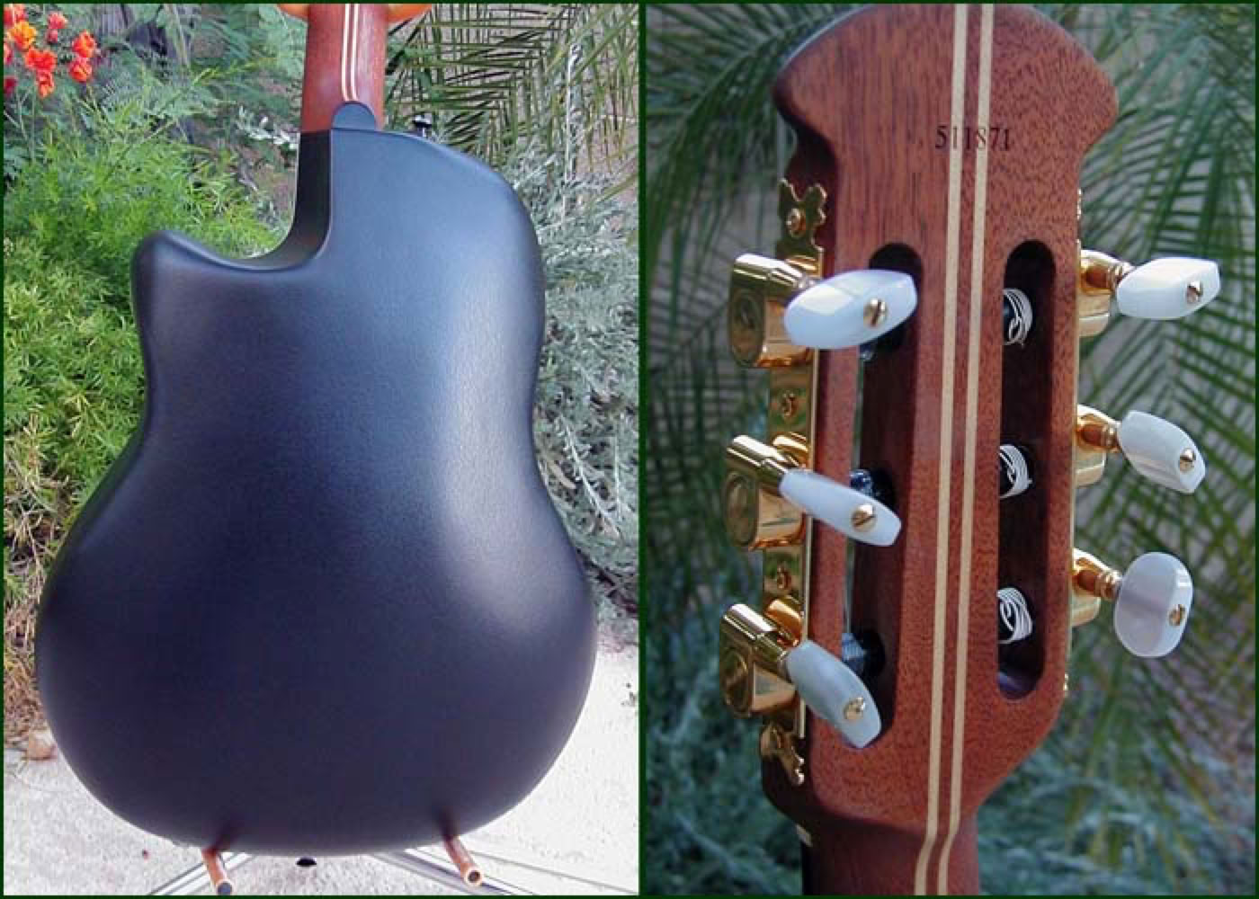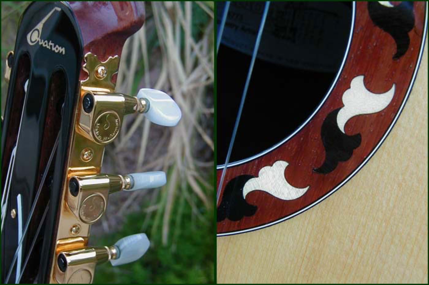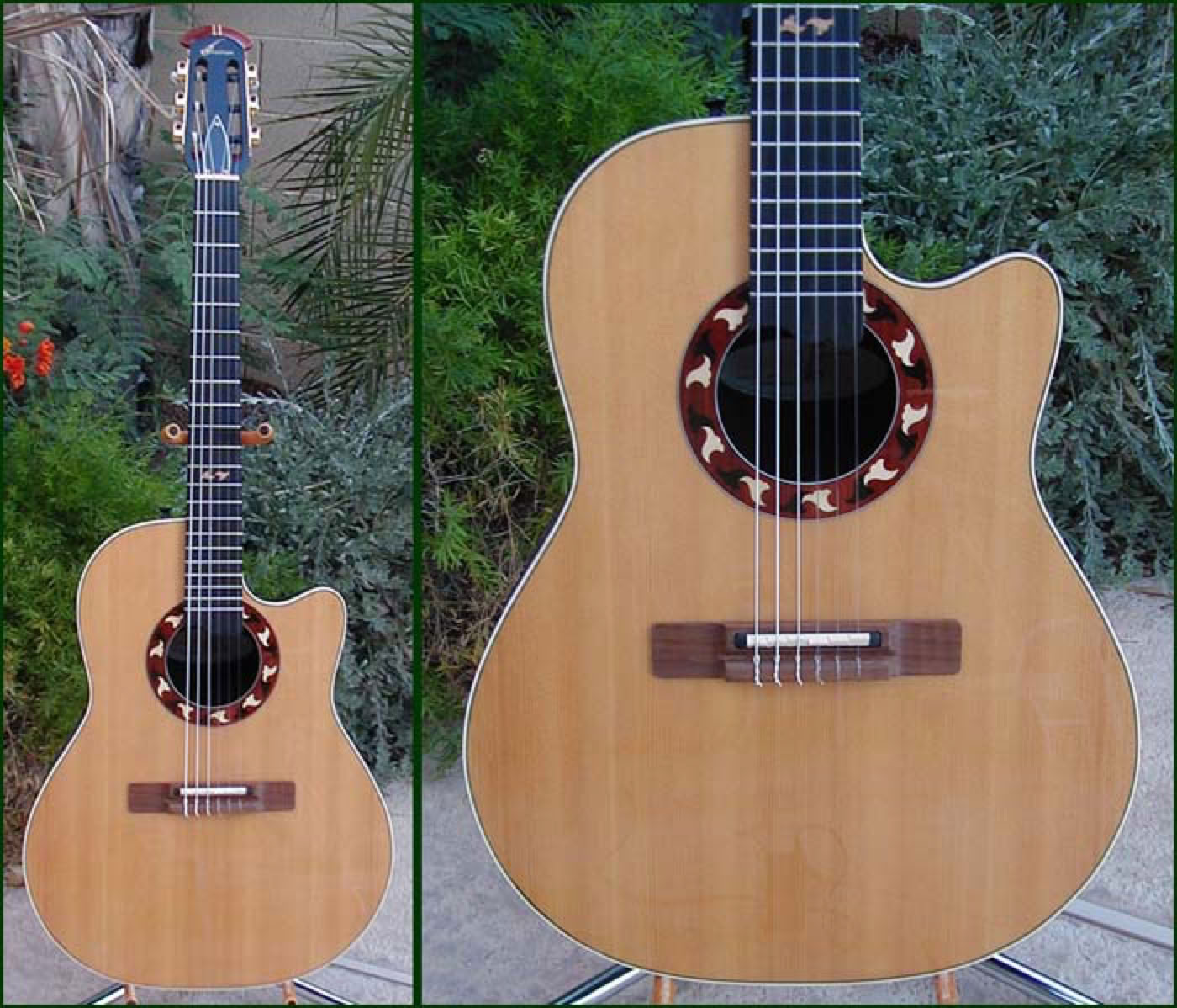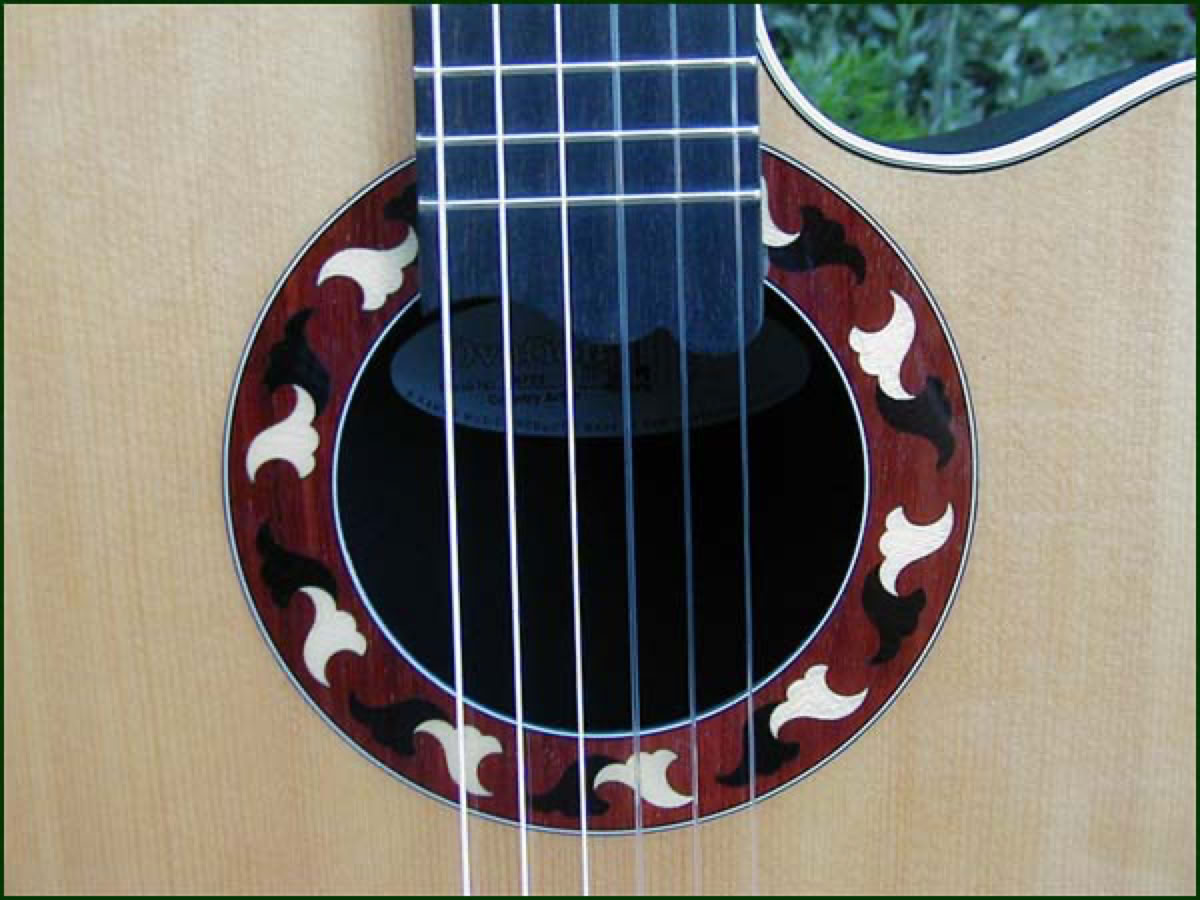 This is the second generation Country Artist. The concept was originally developed in the early 70's for an Artist depth bowl nylon strung guitar that would be different from traditional classicals in that it had a slightly narrower neck of 1-7/8 inch and attached to the body at the 14th fret. The original Country Artist can be found here. Shown below is the second generation Country Artist, model 6773. This guitar maintains many of the same features of the original but uses the mid-depth bowl in a cutaway design. The inlaid rosette is a beautiful intricate design of three wood types and a similar wood inlay is found at the 12th fret. The electronics consist of the wonderful OP-X pre-amp. The guitar shown below is a 1996 model which has had the headstock custom gloss finished and installation of gold Schaller tuners.