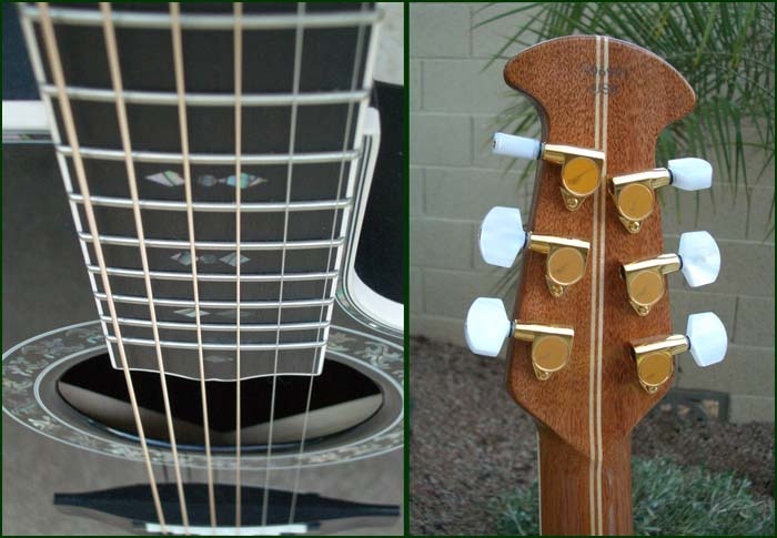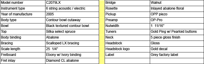 Following quickly on the success of the Contour Bowl introduced on the 2005 Collectors guitar, Ovation started offering in the summer of 2005 a Contour Bowl version of the Custom Legend LX. All other features are standard of the Custom Legend - select sitka spruce top, abalone body binding, 5 piece gloss neck, abalone fretboard inlays, OP-Pro preamp with XLR output, inlayed abalone rosette. But the model C2079, as shown below in gloss black, has the added benefit of the wonderful Contour Bowl. This innovative shape has all the benefits of the traditional lyrachord bowl, but has the added comfort of the new contoured shape. The Custom Legend LX Contour Bowl is currently the top model in the Ovation line and worthy of it.
