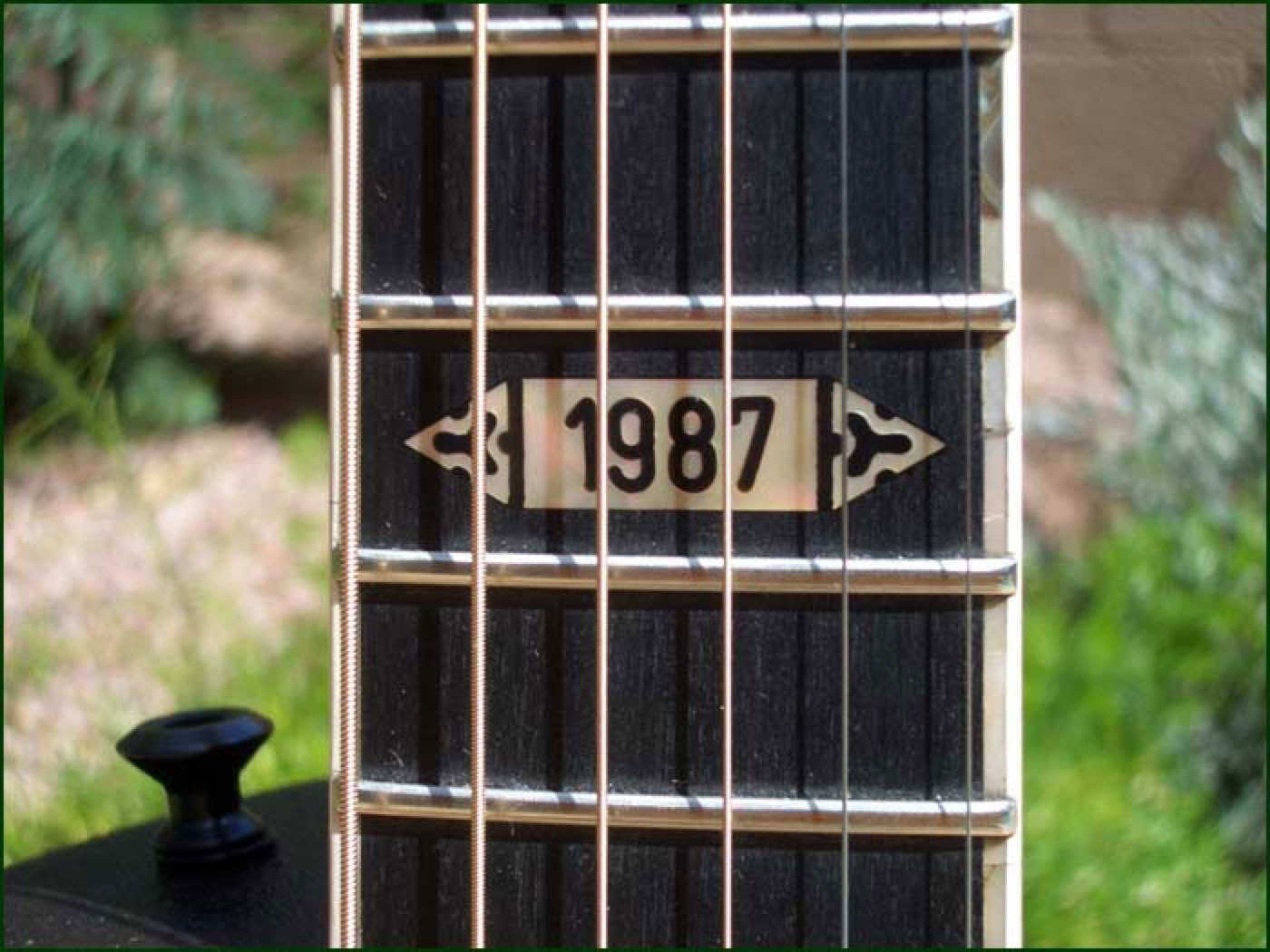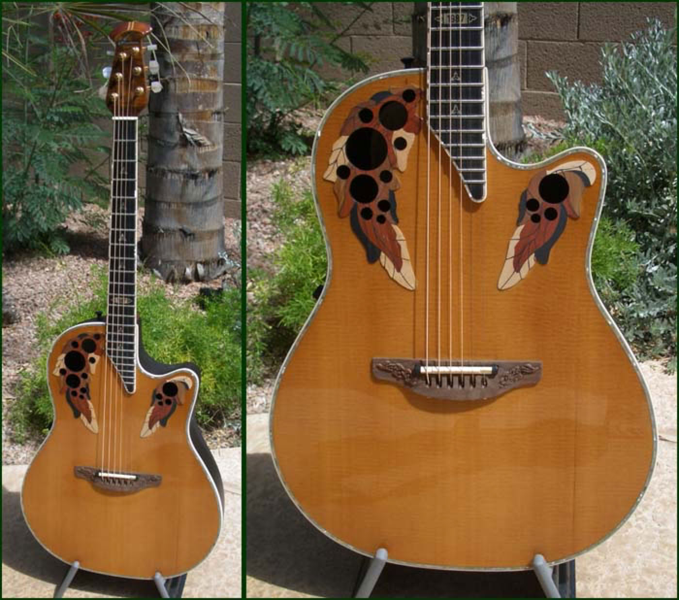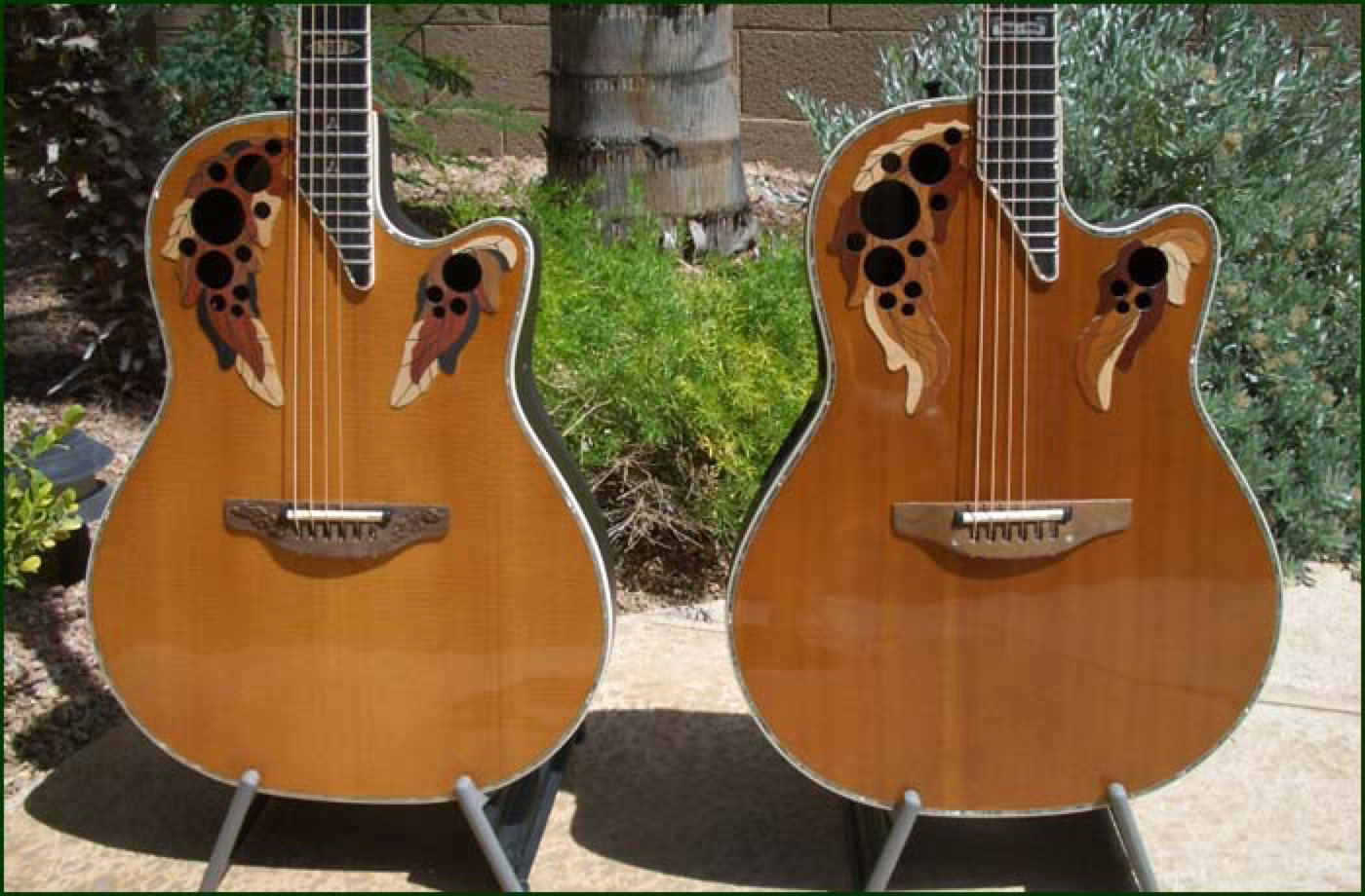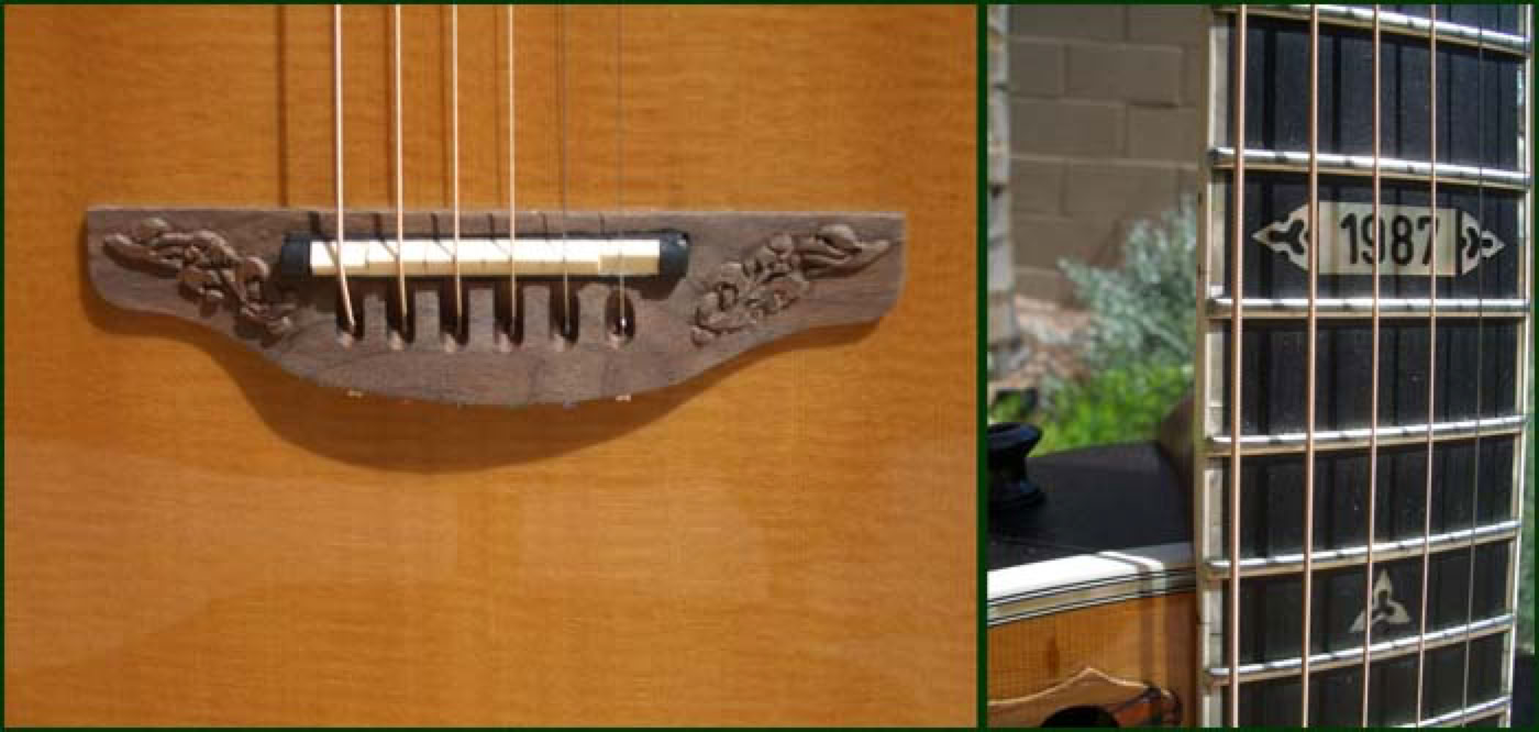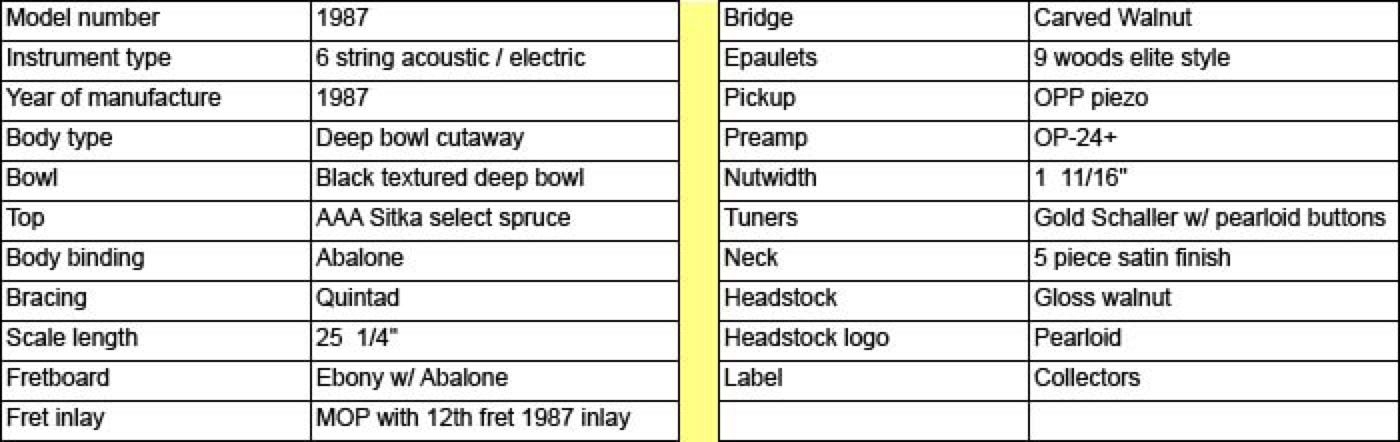 Shown below is the beautiful 1987 Collectors Guitar. Ovation had concentrated for several years on the new super-shallow bowl guitars but for 1987 made a return to their roots and designed a limited edition guitar with emphasis on acoustic sound. The 1987 Collector is a deep bowl elite style guitar with AAA spruce top and quintad bracing. The tone is simply stunning and goes down as one of the finest sounding guitars to be produced in New Hartford. But the 1987 Collector is also quite a looker. For the first time, Ovation applied the cosmetic touches of the Custom Legend to an Elite style guitar - abalone body trim, neck bound in abalone and carved walnut bridge. The 1987 goes down as probably the most sought after of all the Ovation Collectors Series.