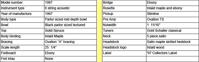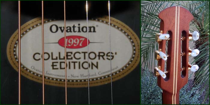 Of all the annual Collectors Series guitars introduced by Ovation since 1982, the 1997 offering is perhaps the most unique and daring. For the first time since the inception of the company, Ovation altered the body dimensions (in a drastic way) and introduced the Parlor Guitar. The Parlor size is smaller than a 000. This required the deign of a completely new bowl, new neck, and new top. The top is a beautifully finished aged toner on solid spruce bound in maple. The center sound hole rosette is also made of individual pieces of maple set in ebony. The slothead neck attaches at the 12th fret. On this model Ovation also introduced a completely new electronics system, comprised of a slimline pickup and the TS (Touch Sensitive) volume control. The TS is build into the top waist of the bowl as a series of touch sensitive bars. Output is though the endpin. The small Parlor body makes this an extremely comfortable guitar to play and the acoustic sound is surprisingly good for its size.