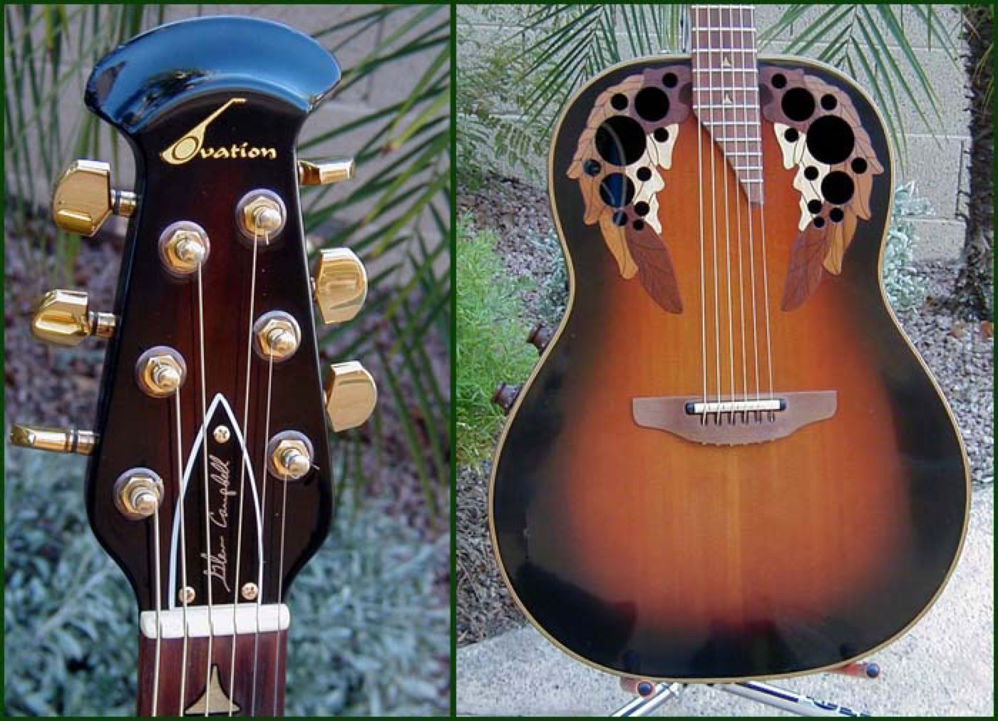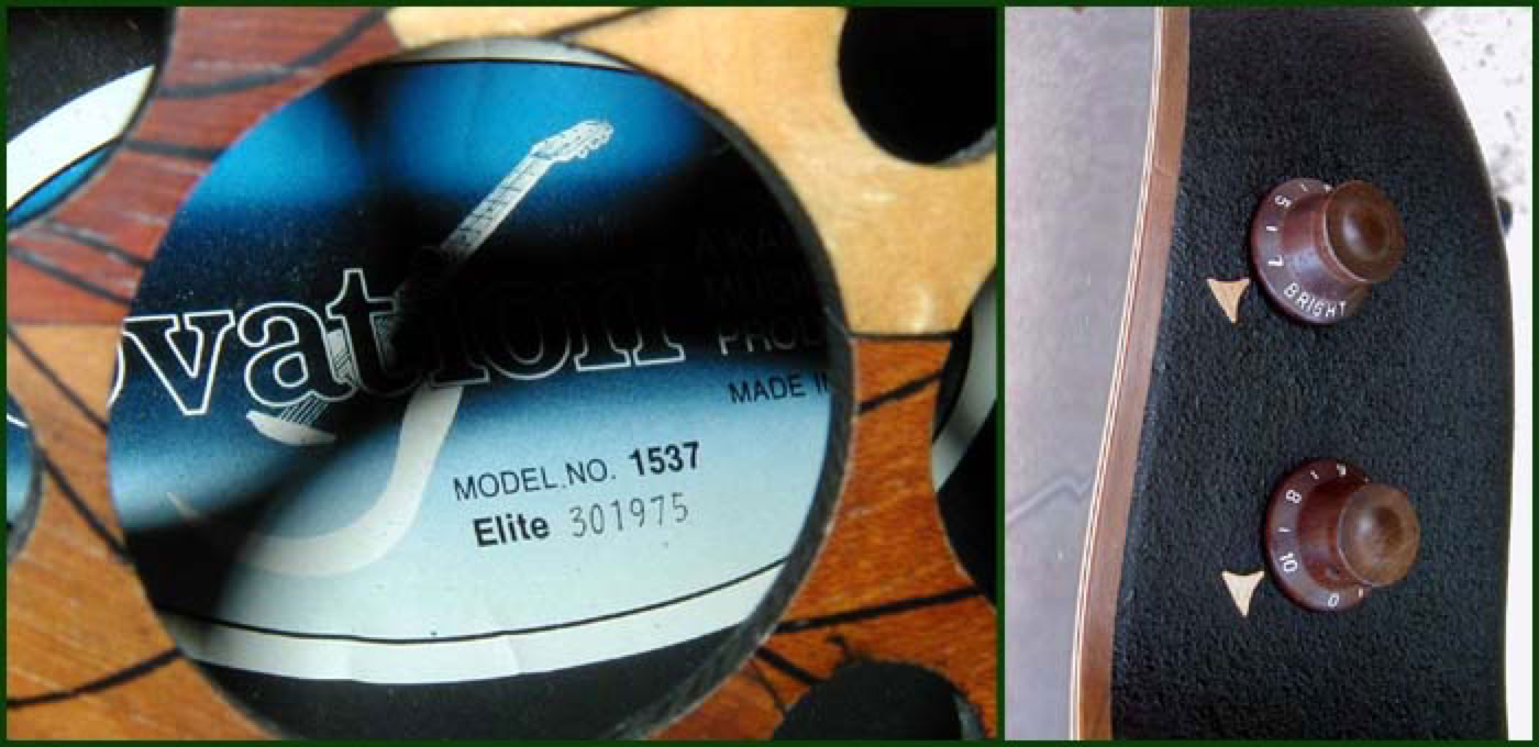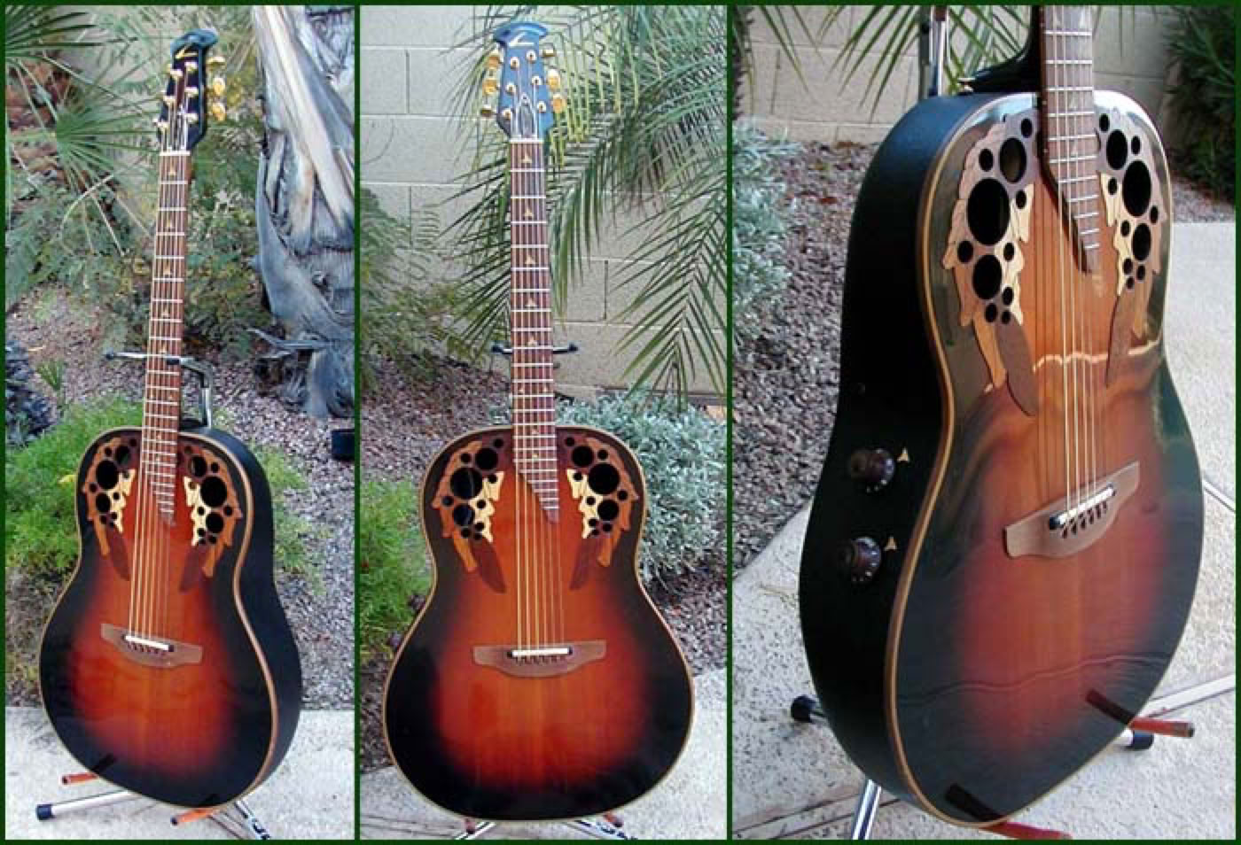 Soon after Ovation introduced the Adamas composite-fiber topped guitar, the obvious question was - could the multi-soundhole design and bracing pattern be implemented on a wood topped guitar? The answer from the engineering department was the model 1537 shown below in sunburst finish. Originally call the "Wood Topped Adamas", it went to market as the first model called the "Elite". The Elite shared the quintad bracing, multi-soundhole design and wooden epaulets of the Adamas combined with a traditional gloss Ovation neck, headstock and gold Schaller tuners. The fretboard was black walnut with maple inlays. The select spruce top and body was also bound in wood inlay and housed the same 2-knob electronics as the Adamas. The Elite 1537 is not as loud or projecting as it's composite-fiber topped brother, but rather has a very mellow and "woody" sound. It is perhaps the closest Ovation has ever come to copying the sound of their wooden-box competitors. The Elite 1537 was only produced for a few short years, which makes it a very sought after guitar for collectors and players alike.