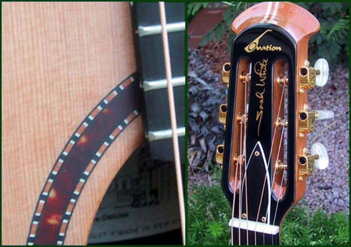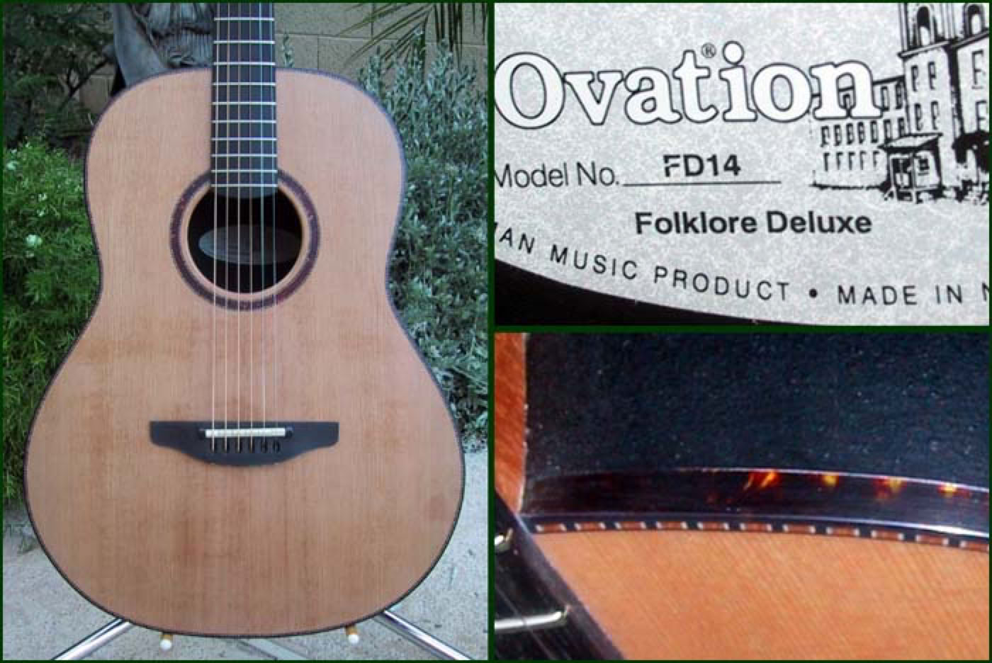 The Ovation Folklore Deluxe, model FD-14, is perhaps the best sounding acoustic guitar that New Hartford has ever produced. That's a bold statement to be sure. But I've played this wonderful limited edition next to Shiny Bowls, Adamas, Elites, and Custom Legend and each time I come away amazed. In 2003 the boys at Ovation set out to build an acoustic players guitar modeled after the original Josh White (and later the Folklore). What resulted was a limited run of 50 instruments from a very different mold. The body is a deep bowl, non-cutaway trimmed in inlaid walnut and tortoise shell. The sound hole rosette is also of a beautiful hand laid walnut and tortoise shell. The 12 fret neck is a slightly narrower version of the original (1-3/4"), yet still wider than the standard steel string guitars. The soundboard is a satin finished cedar, which has an amazing woody mellowness to it. Topping it off is a wonderful slotted headstock, which I've had gloss finished and adorned with the Josh White signature in honor of the original. A fixed EQ on-board pre-amp feeds the direct out to the endpin jack.