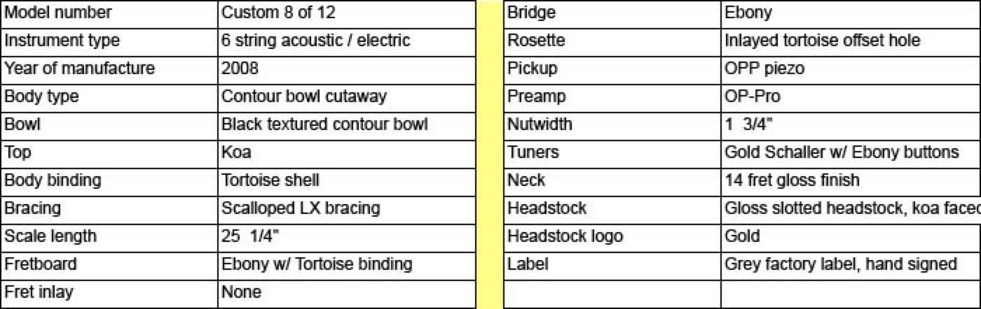 In early 2007, Lost Art Vintage Instruments of Bellmawr NJ built a limited run of 12 Koa topped guitars. These rare guitars were built based on a prototype of the previous year. The most notable characteristics of this instrument are of course the koa top and the unique sound hole. Ovation has experimented for years with alternative soundhole design and placement, and this offset design trimmed in tortoise shell provides for a unique voicing of this instrument. Louder, deeper and clearer than you would normally expect from a koa topped guitar. The same tortoise shell trim is applied to the body edge binding and fretboard binding. The bowl is the Contour design and electronics feature the new VIP-5 image modeling system.