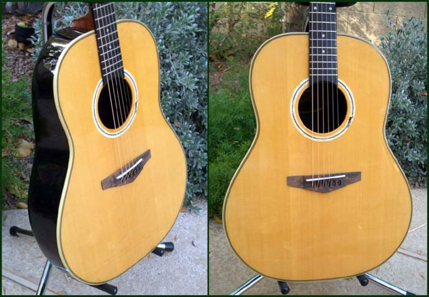 2006 marked the 40th anniversary of Ovation guitars. To commemorate this occasion, Ovation produced a very limited number of four vintage models that helped shape the company. The original shiny bowl models K-1111 Balladeer and K-1114 Josh White. And the popular early 70's models the 1618-1 Pacemaker A/E 12-string and the 1627-4 Glen Campbell Artist Balladeer. These models were built with the same materials and construction techniques as the originals. Shown below is my model K-1111 Balladeer reissue. I've owned several of the originals and I can attest that this is a very fine recreation. This guitars features the shiny fiberglass cloth bowl, 3 piece spruce top, 5 point Brazilian rosewood bridge, enclosed Kluson vintage tuners and the inlayed chainlink rosette. The attention to detail of the recreation is stunning, right down to the shape of the thick lip headstock and script model name logo. The sound and playability is everything that put the company on the map so many years ago. This guitar is serial number 02 of the reissue run.