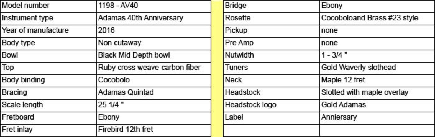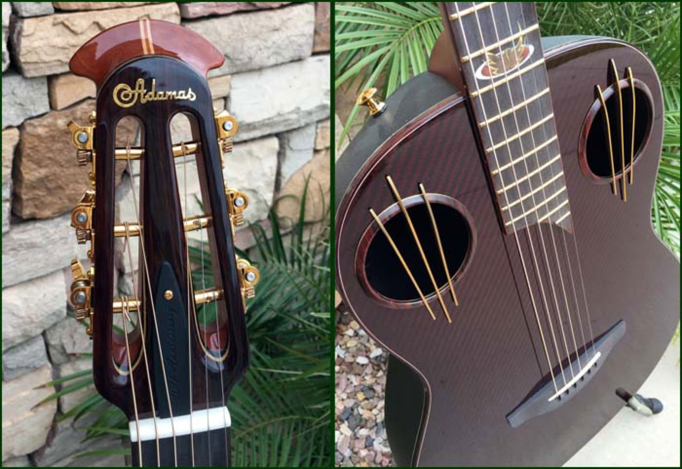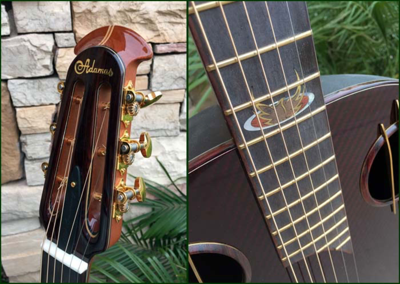 2016 marked the 40th anniversary of the Adamas guitar. Introduced in 1976, the carbon fiber topped Adamas literally reset the standard by which all previous and future Ovation guitars would be judged. To celebrate the 40th anniversary Ovation produced a limited number of Adamas guitars in a unique configuration which incorporated both historical as well as newly developed technologies. Most notably the dual sound holes are adorned with the three bars (aka “Bearclaw”) that were seen on some early Adamas prototypes. The neck is a 12 fret 1-3/4 nutwidth similar to what had been the U681 model with slotted headstock. And the fretboard features a unique “Phoenix” inlay which some believe depicts the brand rising from the ashes. My guitar shown below is s/n 02 of the limited run, which I was fortunate to be able to order through Lost Art Vintage Instruments to include custom Waverly gold tuners to further setoff the beautiful slotted headstock.