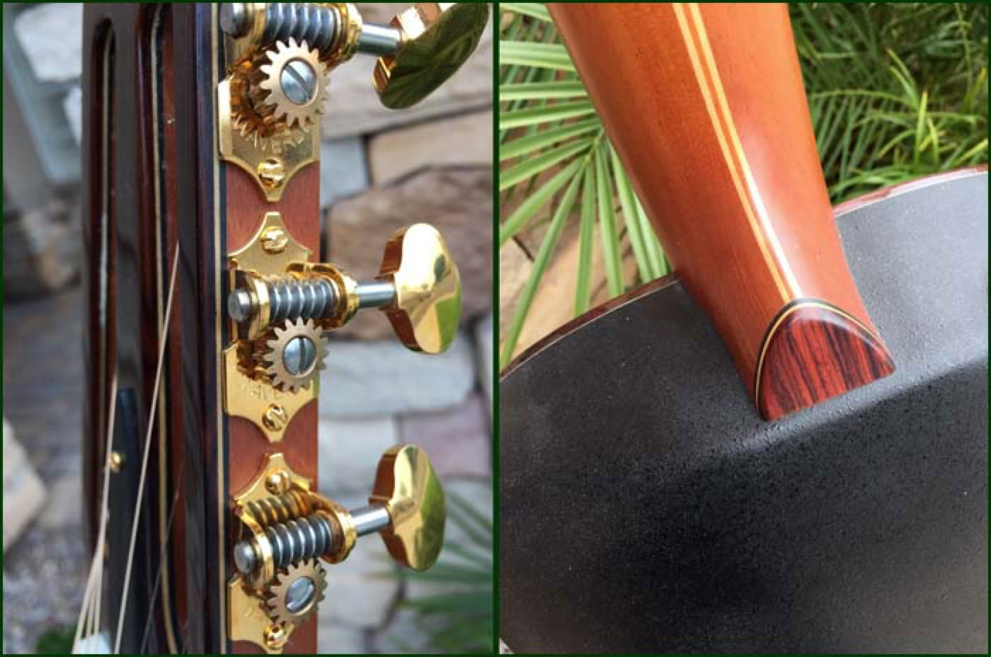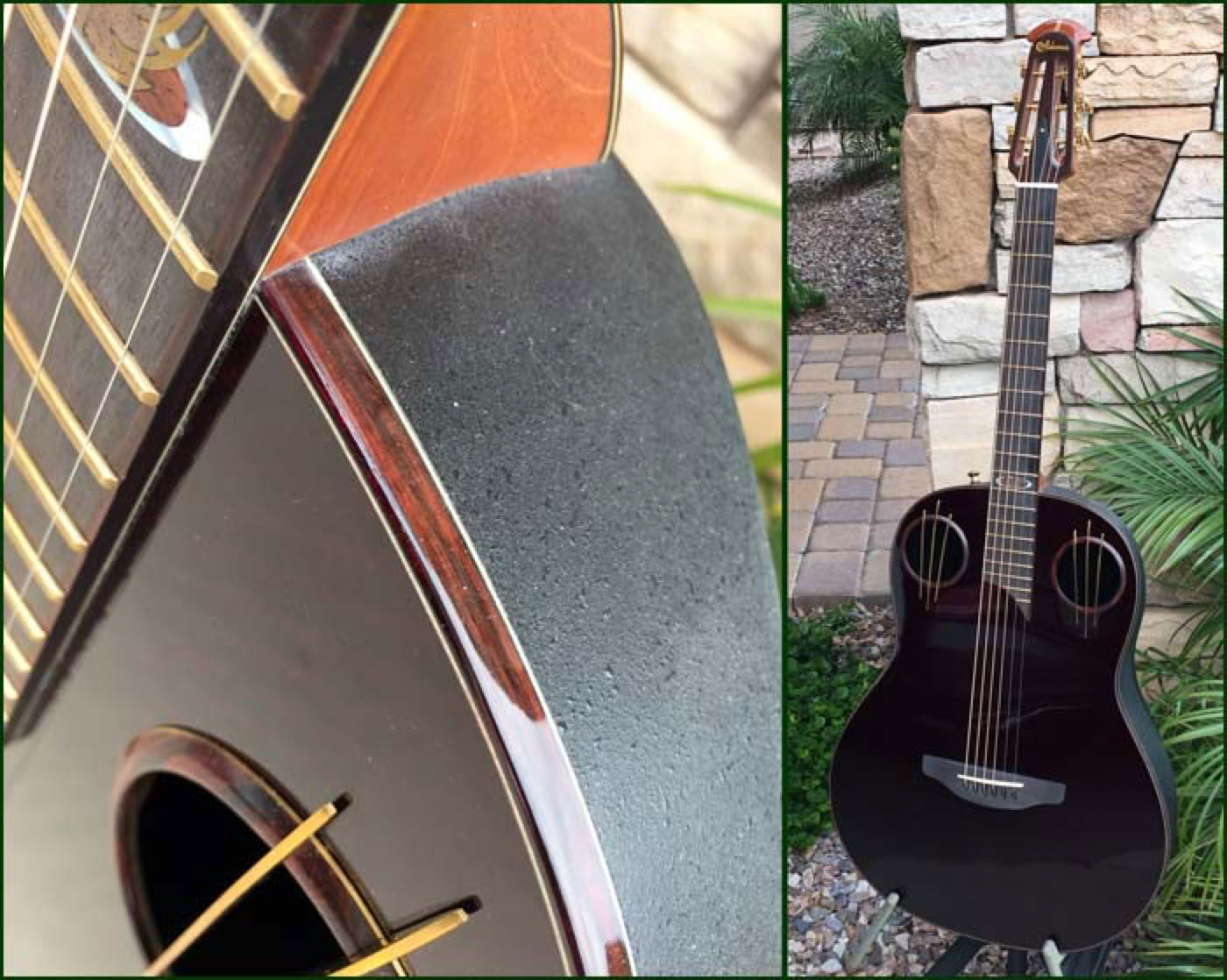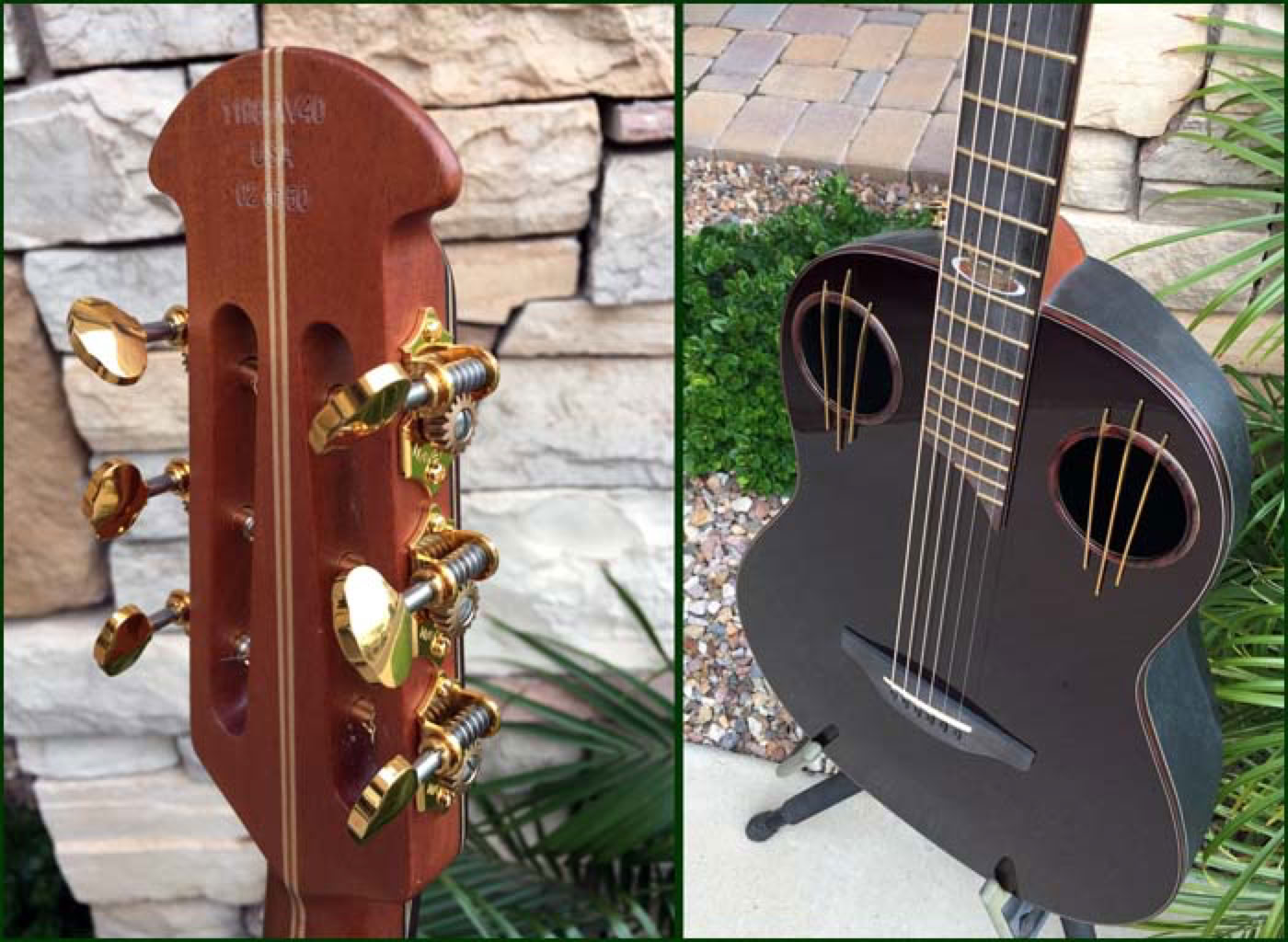 2016 marked the 40th anniversary of the Adamas guitar. Introduced in 1976, the carbon fiber topped Adamas literally reset the standard by which all previous and future Ovation guitars would be judged. To celebrate the 40th anniversary Ovation produced a limited number of Adamas guitars in a unique configuration which incorporated both historical as well as newly developed technologies. Most notably the dual sound holes are adorned with the three bars (aka “Bearclaw”) that were seen on some early Adamas prototypes. The neck is a 12 fret 1-3/4 nutwidth similar to what had been the U681 model with slotted headstock. And the fretboard features a unique “Phoenix” inlay which some believe depicts the brand rising from the ashes. My guitar shown below is s/n 02 of the limited run, which I was fortunate to be able to order through Lost Art Vintage Instruments to include custom Waverly gold tuners to further setoff the beautiful slotted headstock.