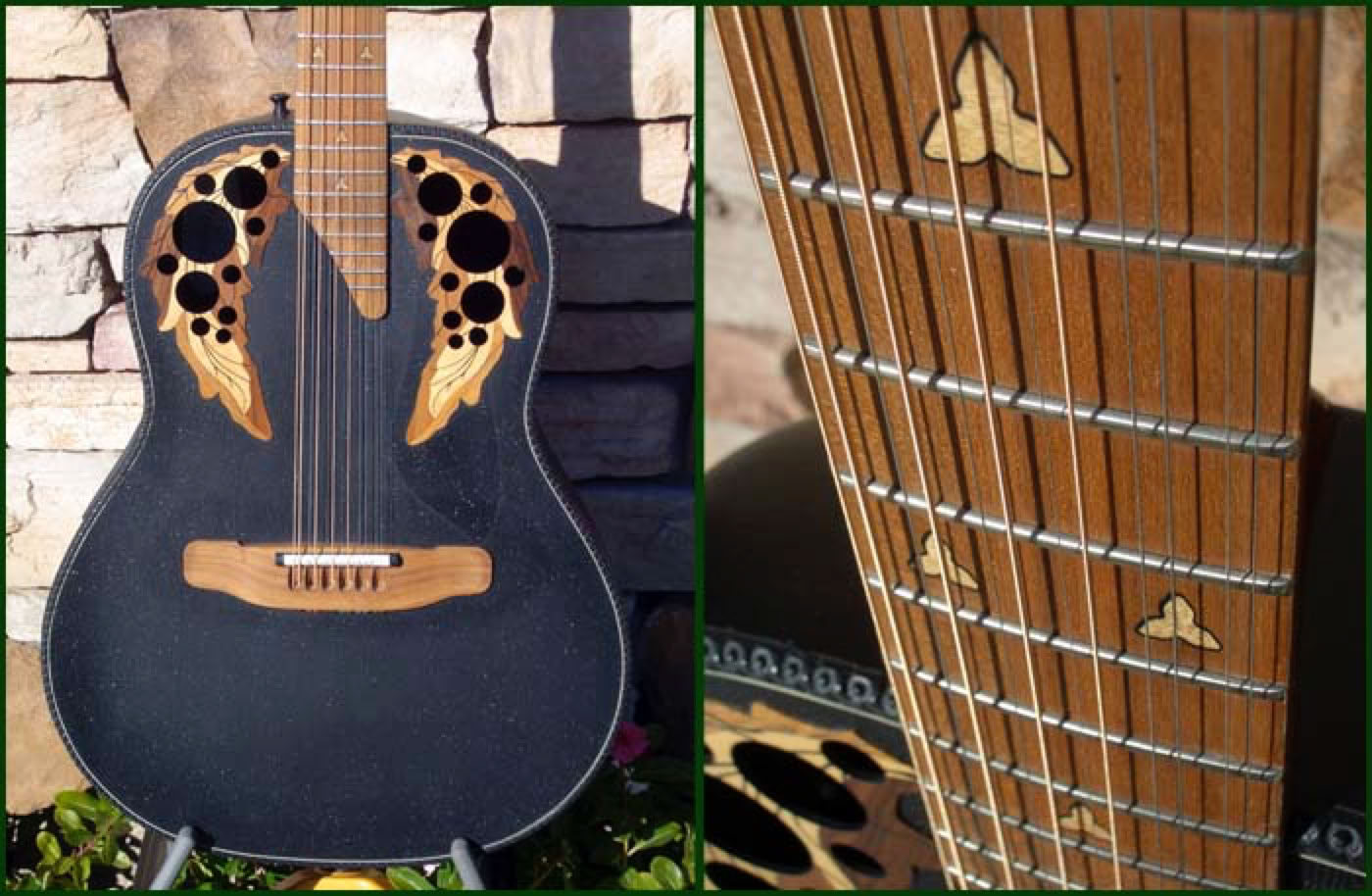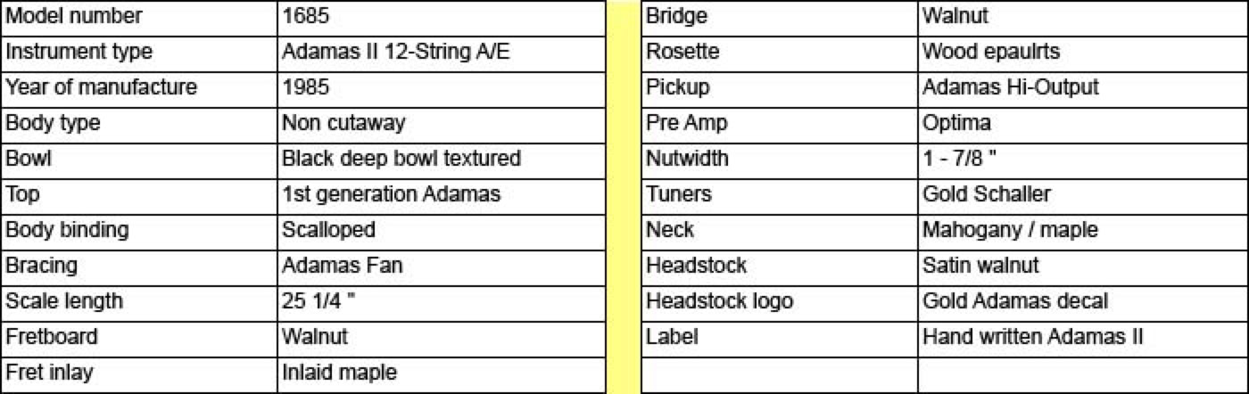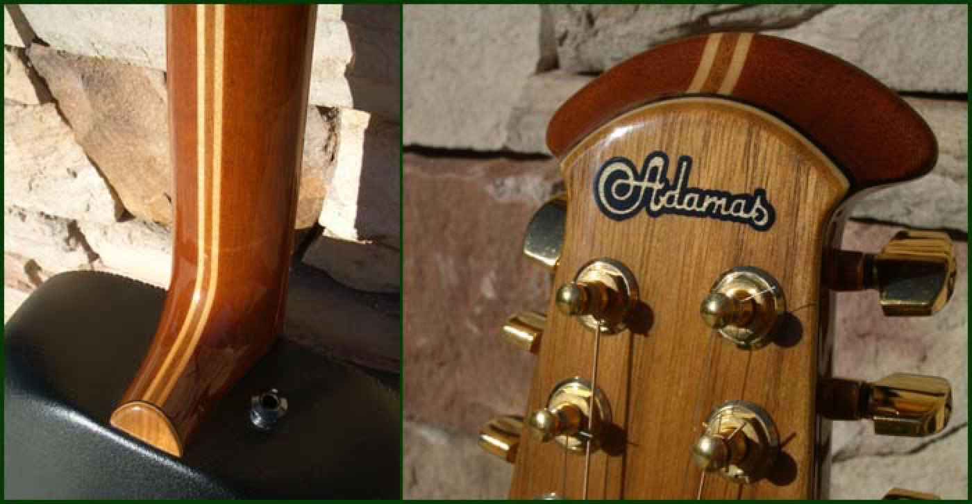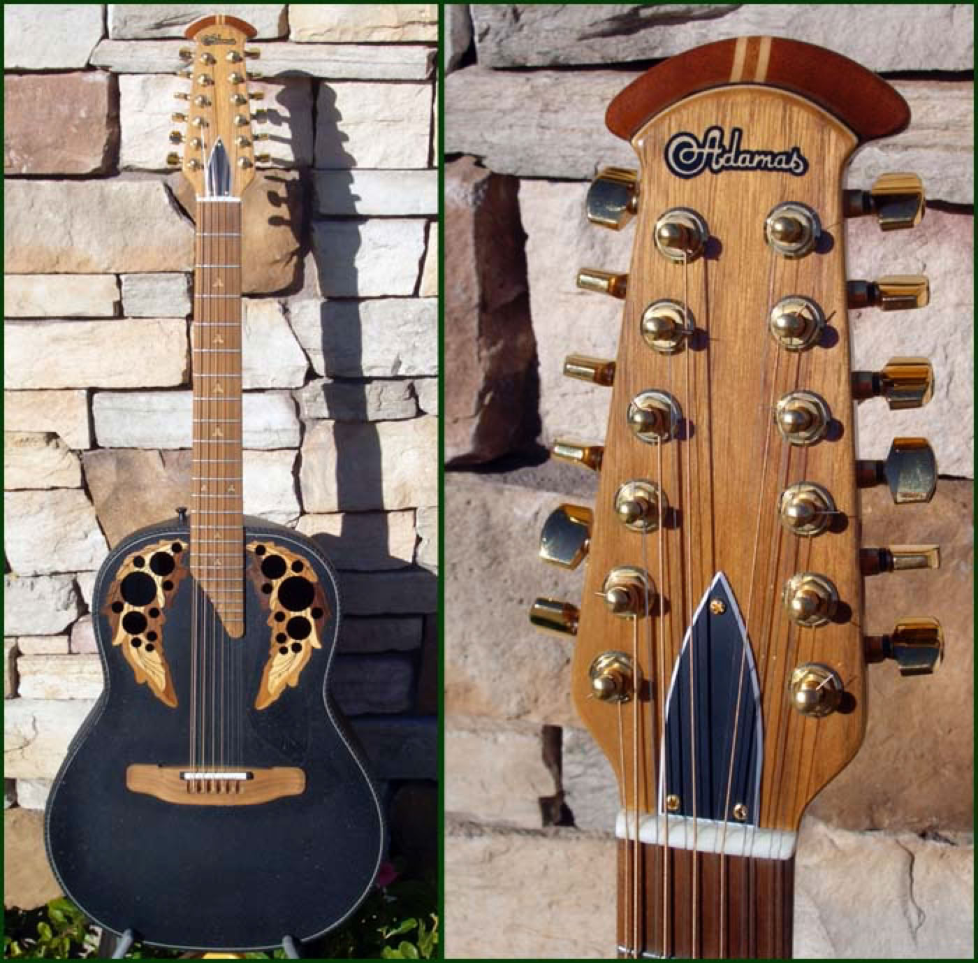 The Adamas 12-String is a guitar that just takes your breath away. The size and clarity of the sound is stunning and the playability is by far the best of any 12-string available. The example shown below is an Adamas II model 1685 in black sparkle finish. This is the original textured top series with deep bowl, walnut fingerboard and bridge, gold Schaller tuners, inlaid walnut fret markers and Optima electronics system. This particular guitar has had it's neck and headstock custom gloss finished.