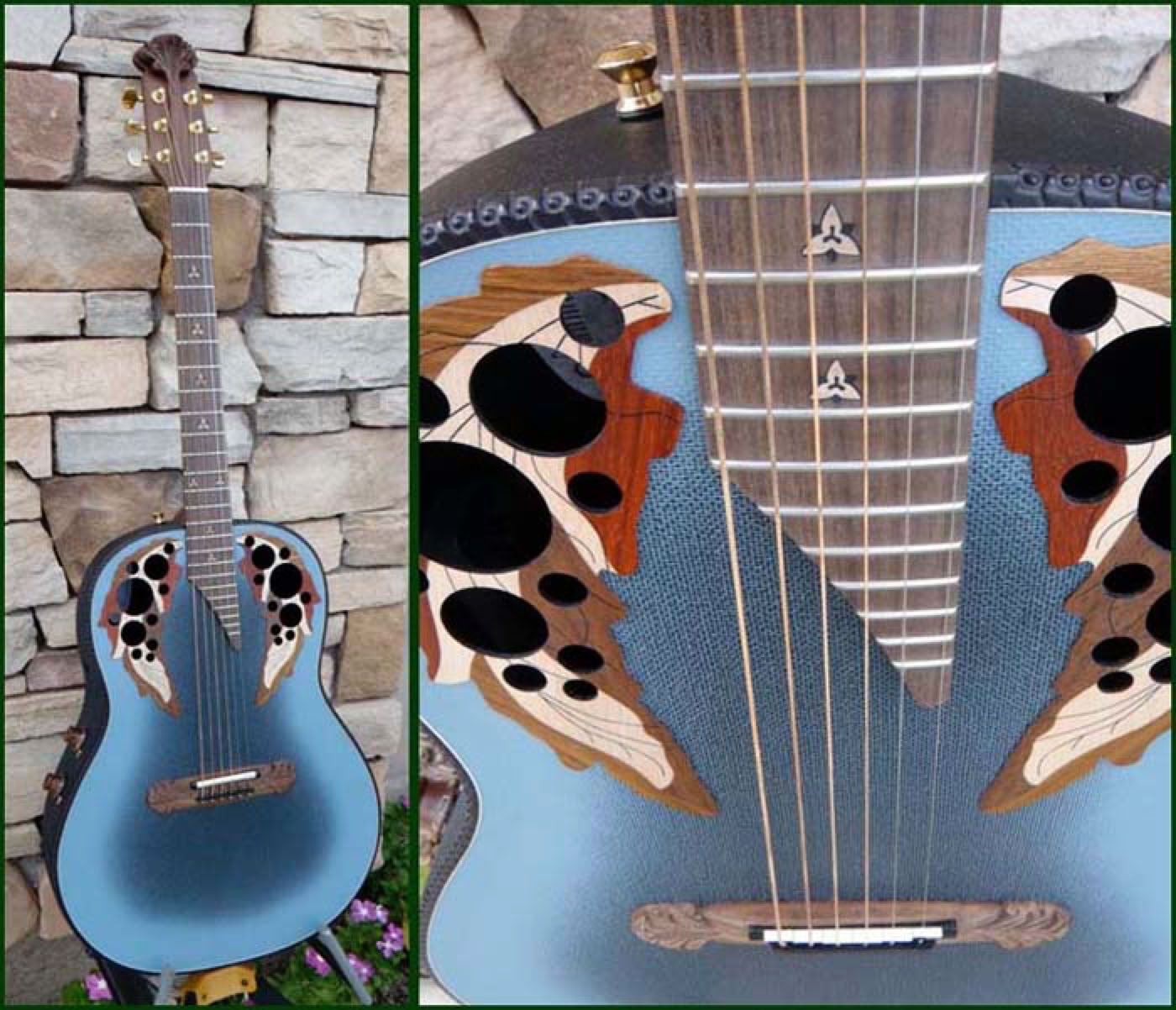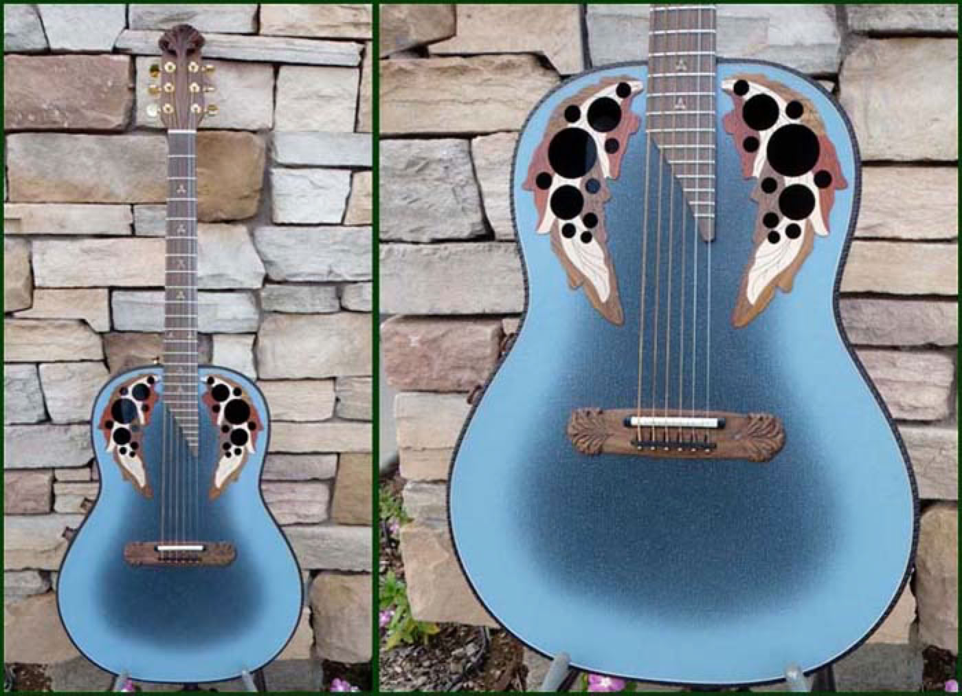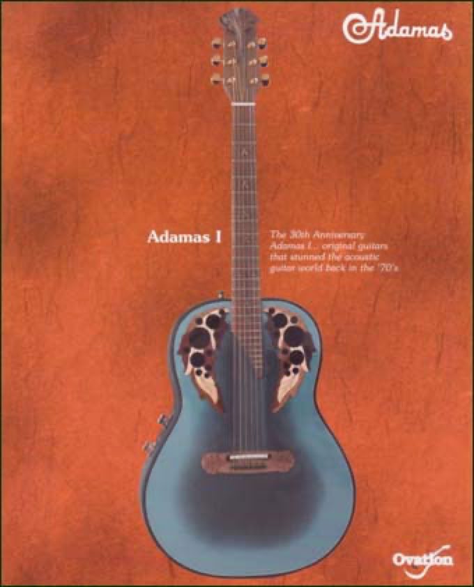 In celebration of the Adamas 30th Anniversary the factory produced a special reissue of the model 1687-8 which was the first production Adamas model. They meticulously reproduced the reverse blue fade textured top, the carved headstock and bridge, the metal flake bowl finish and the walnut neck/fretboard with inlays. The even reproduced the original 2-knob stereo preamp system right down to the walnut knobs. The reissue model was as faithful to the original as possible and only a keen eye would spot the subtle differences. Approximately 150 guitars were produced, of which I purchased 3 from Lost Art Vintage Instruments, including the one shown below.