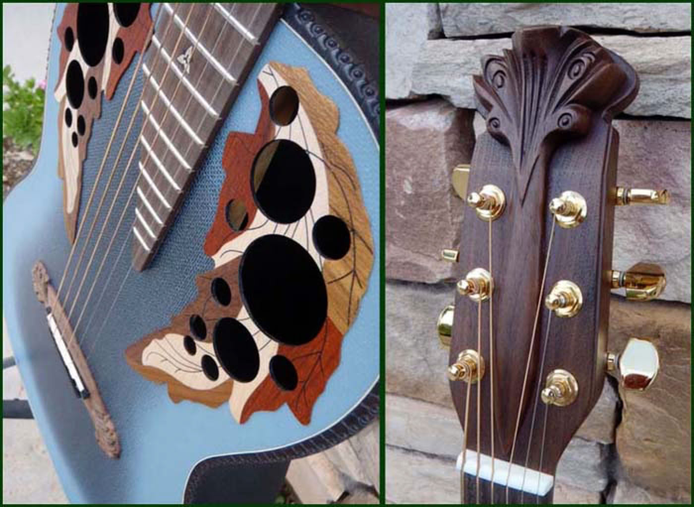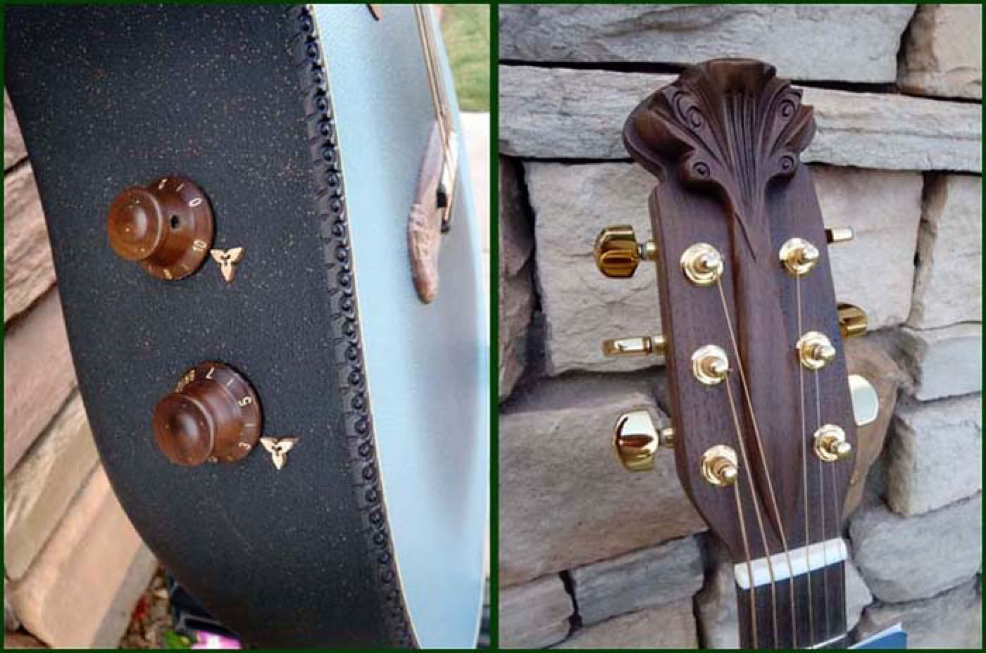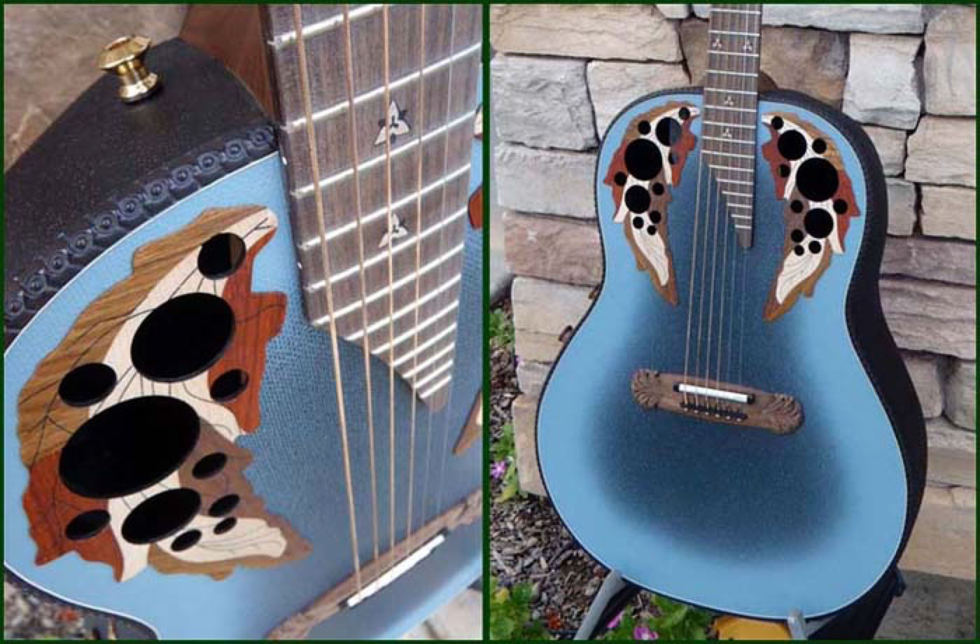In celebration of the Adamas 30th Anniversary the factory produced a special reissue of the model 1687-8 which was the first production Adamas model. They meticulously reproduced the reverse blue fade textured top, the carved headstock and bridge, the metal flake bowl finish and the walnut neck/fretboard with inlays. The even reproduced the original 2-knob stereo preamp system right down to the walnut knobs. The reissue model was as faithful to the original as possible and only a keen eye would spot the subtle differences. Approximately 150 guitars were produced, of which I purchased 3 from Lost Art Vintage Instruments, including the one shown below.