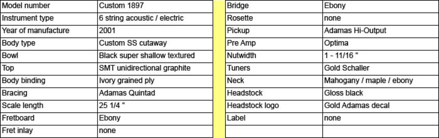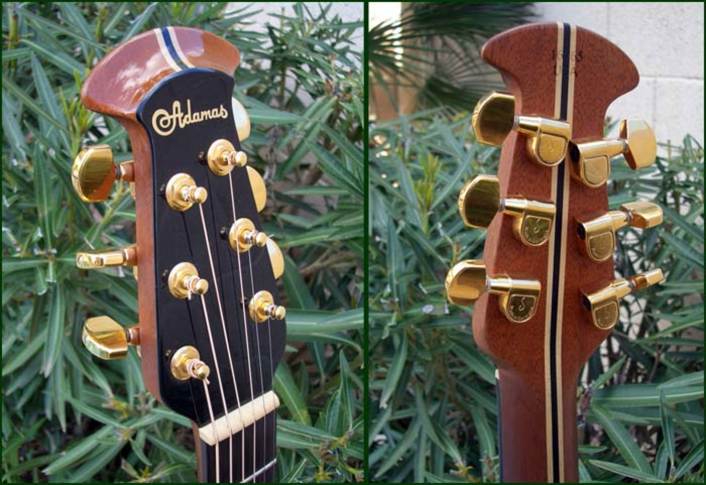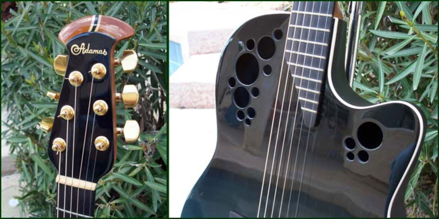 The Adamas SMT is Ovation's smooth, uni-directional, graphite topped guitar. The example shown here is a custom order greyburst gloss finish with the following non-standard features: super-shallow cutaway bowl, no fretboard markers and no wood epaulets surrounding the multi soundholes. The result is a gloss guitar that almost looks black and has nearly no ornamentation other than the gold Schaller hardware and gold Adamas headstock logo. The black on black motif has earned this guitar its nick-name of "Stealth Adamas". The fast action neck and super shallow body make this Adamas play very "electric like" and along with the Optima electronics earn it high marks as a stage guitar (minus the greasy fingerprints). For a super shallow bowl guitar, the unplugged sound is amazingly full and detailed, although not especially loud. Of all the guitars in my collection this is the one that usually gets the question, "What the heck is THAT?"