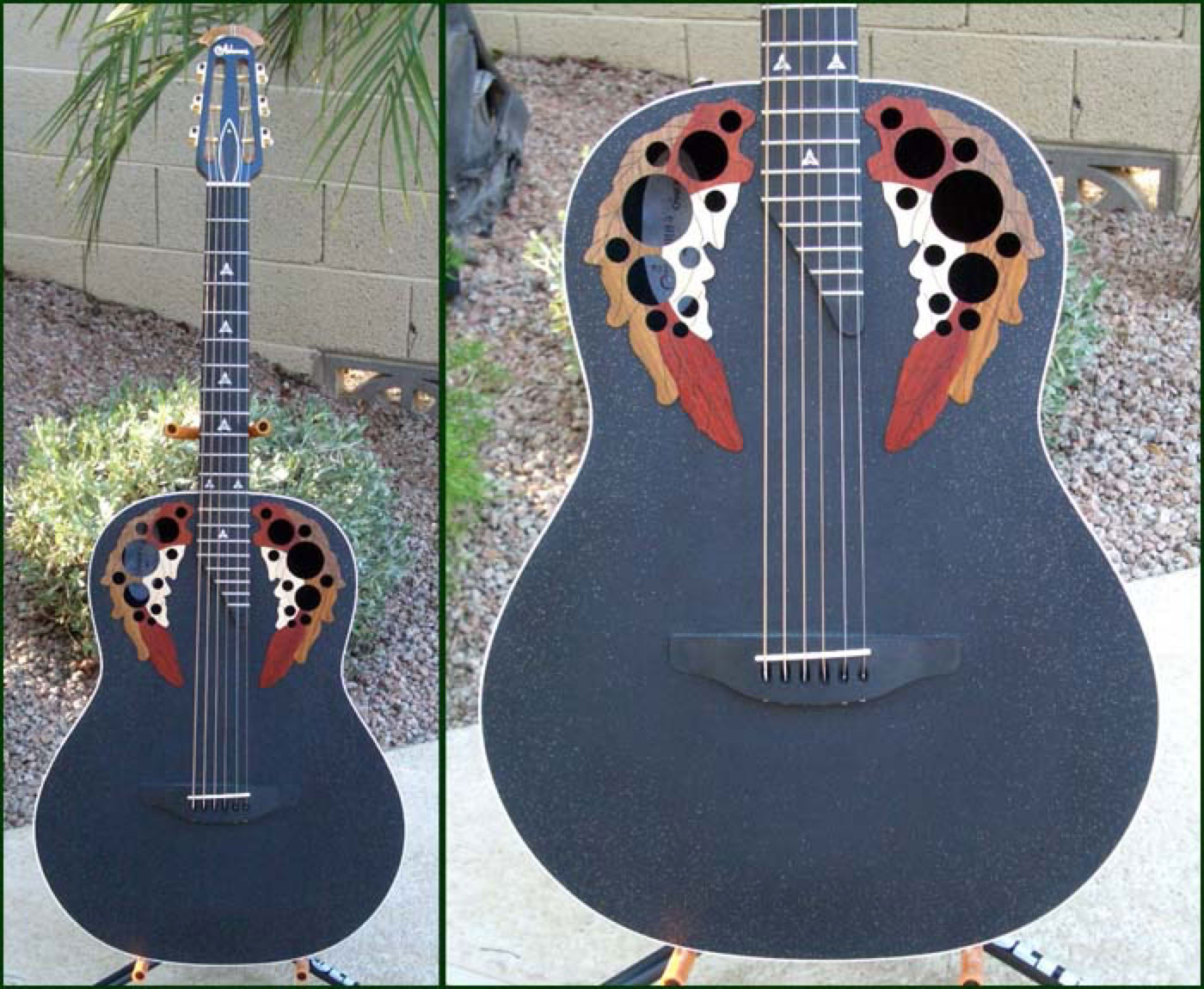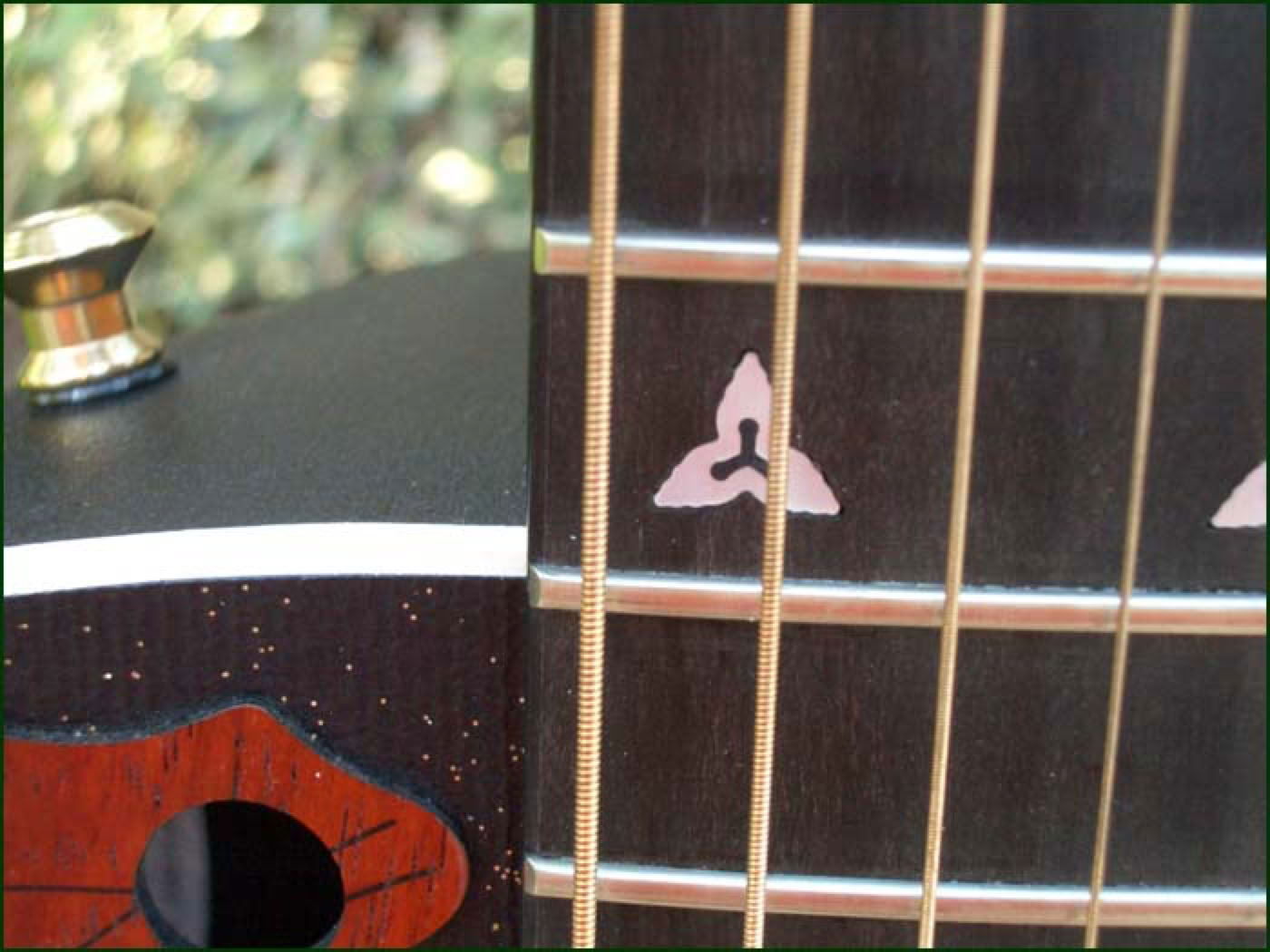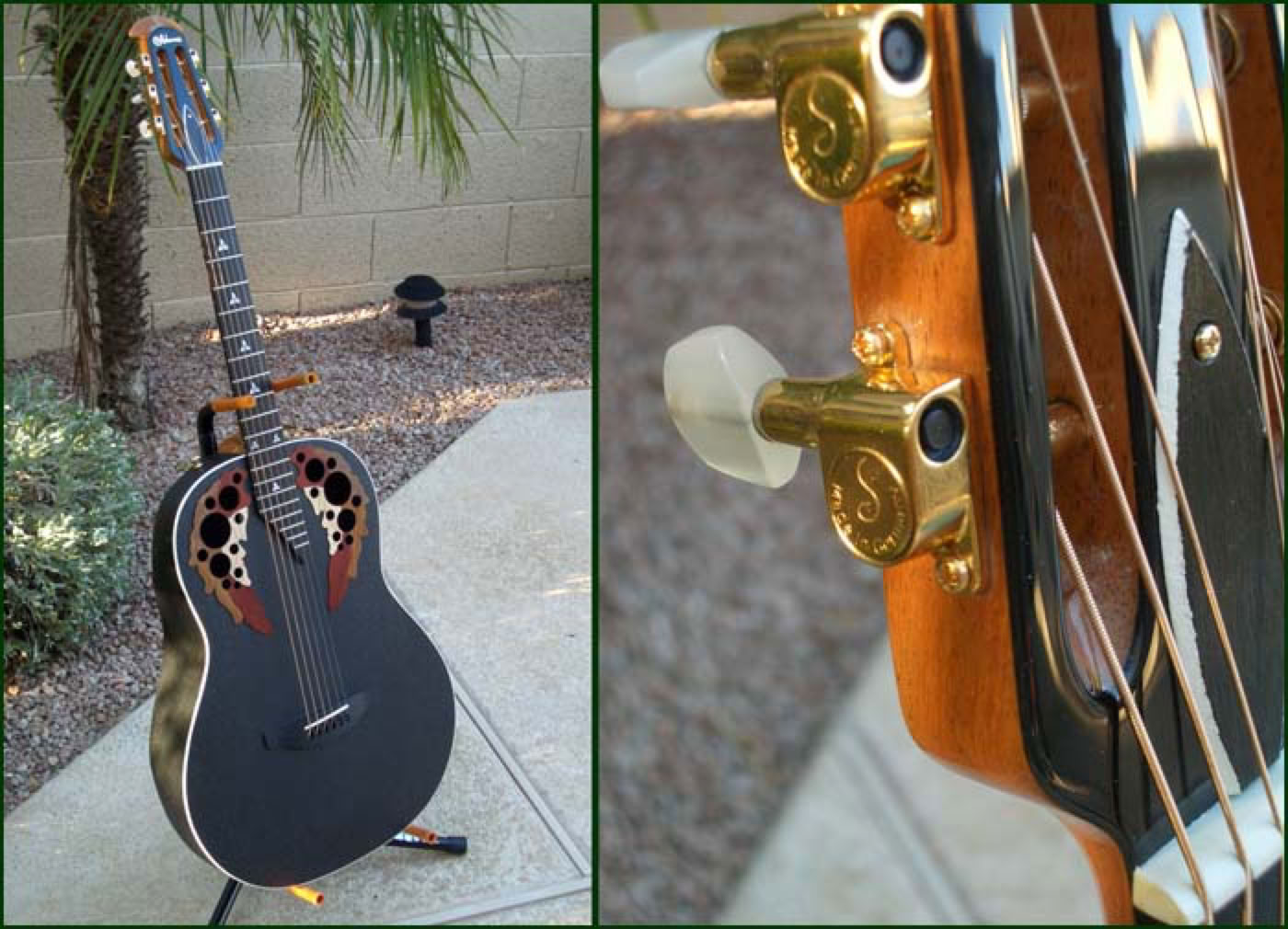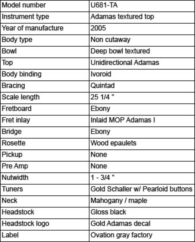 In 2003 Ovation built two new slothead prototypes which were the Adamas version of the wonderful FD-14 wood topped guitar. The results were so stunning that for 2005, they offered a limited run of 100 copies of the Adamas U681. The configuration of the U681 is 12 frets to the body, slotted headstock, wide 1-3/4 inch nut. All the ingredients for incredible sound, which is exactly what this guitar produces. The U681 literally outshines all other Adamas guitars I have ever played. Without question it is THE finest composite topped guitar I have ever heard. The standard configuration for this limited run is OPP pickup and OP-Pro preamp. However, I wanted the cleanest possible pure acoustic sound, so I special ordered mine (shown below) as an acoustic only version. In addition I upgraded to a gloss neck and headstock, and pearloid tuners. This is an extremely rare guitar, only 100 copies, and a true shining star of what the Ovation/Adamas factory can turn out.