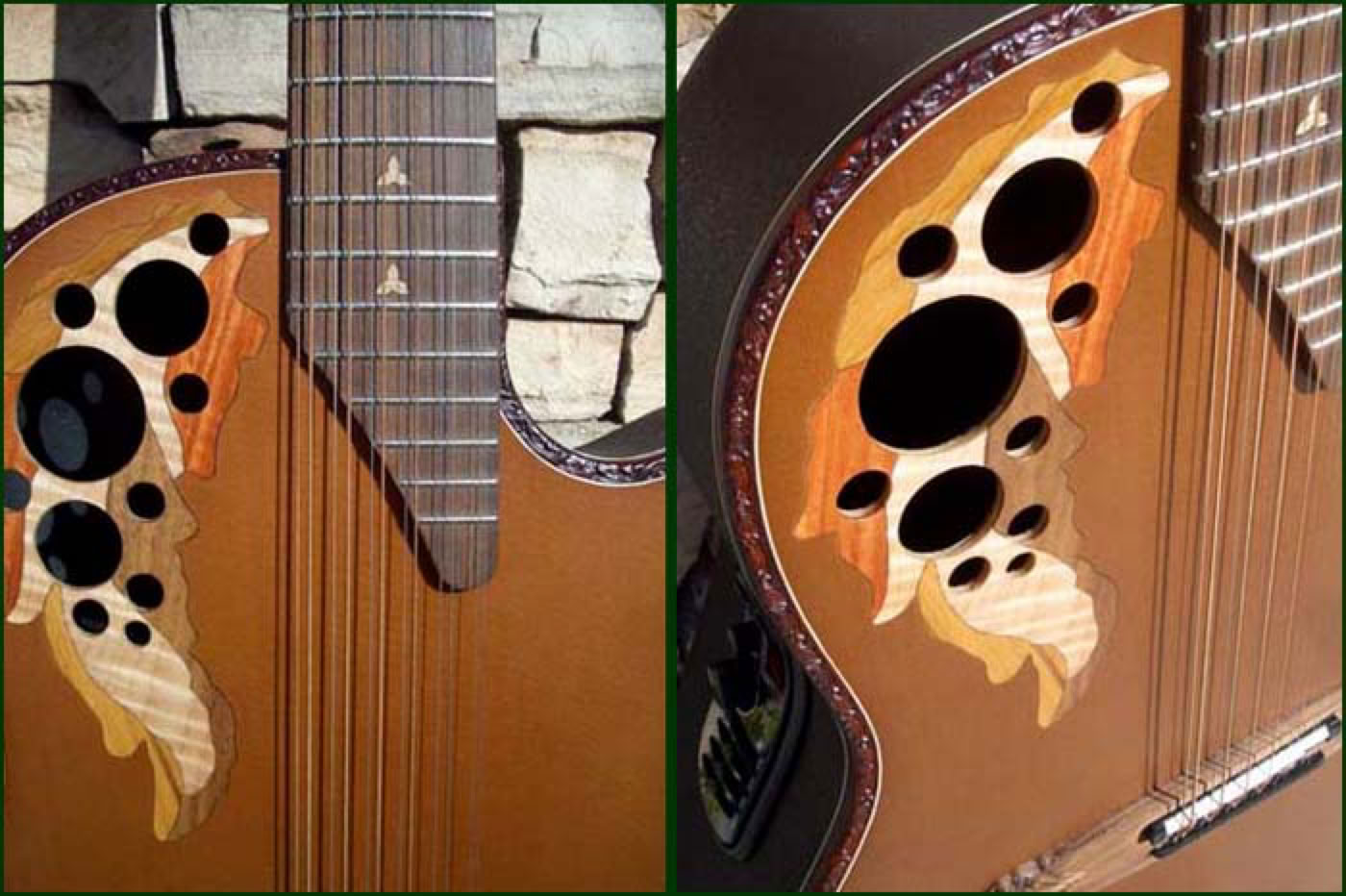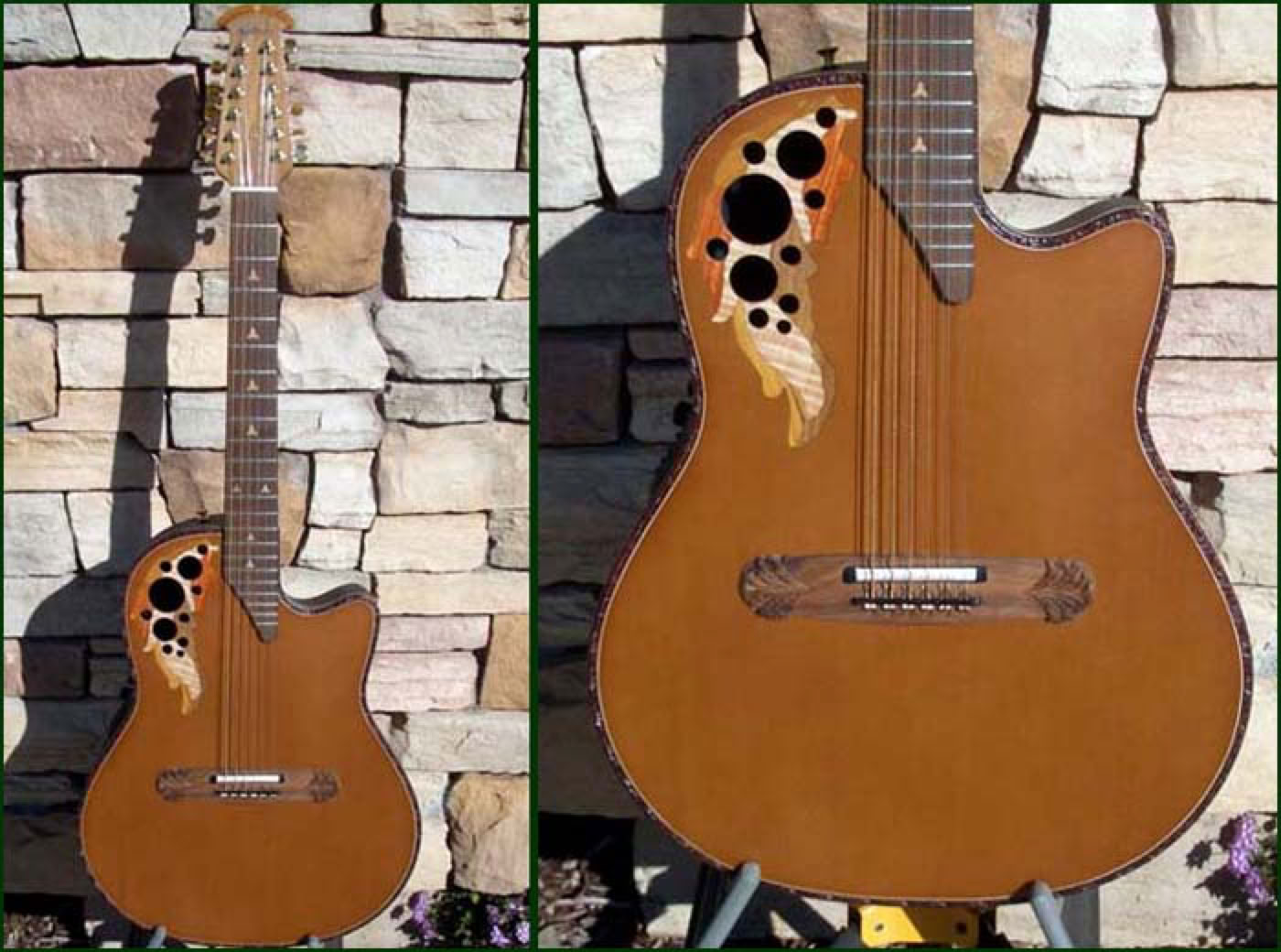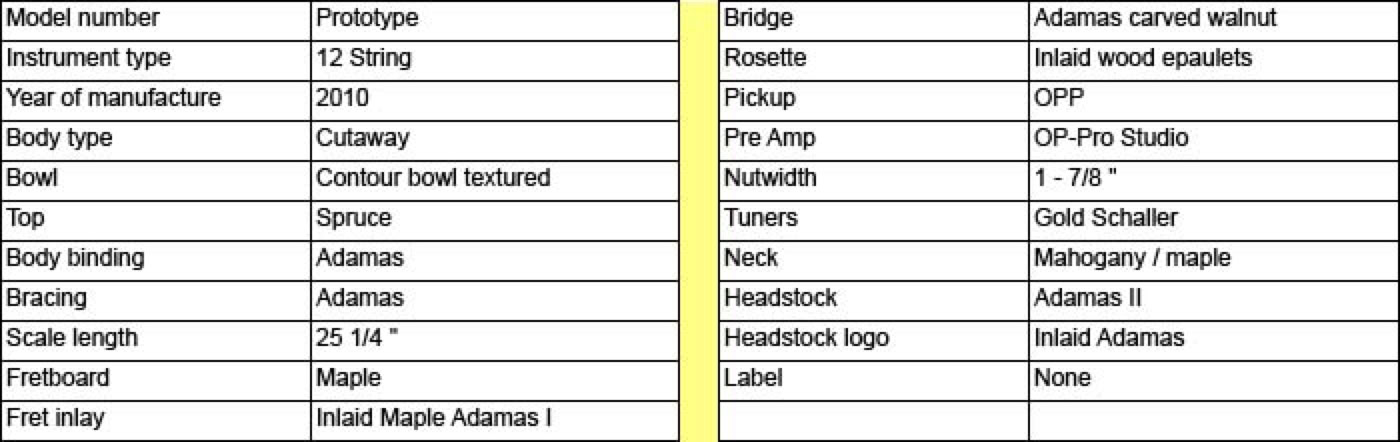 Fall of 2010 the Adamas Custom Shop built a few one off prototypes for a Roadshow. Shown below is the Wood Top Adamas 12-String. Through Lost Art Vintage Instruments I was able to purchase this guitar. An amazing specimen of power, depth and quality. The tonal range of this instrument is stunning and the only thing to match its voice is its good looks. The spruce top is finished in a deep pumpkin color with flush inlaid epaulets and Adamas neck with maple fretboard. The contour bowl is hand laid fiberglass and electronics are handled by the OP-Pro Studio.