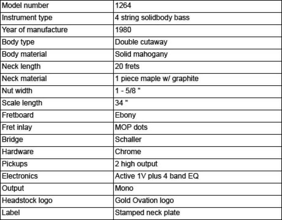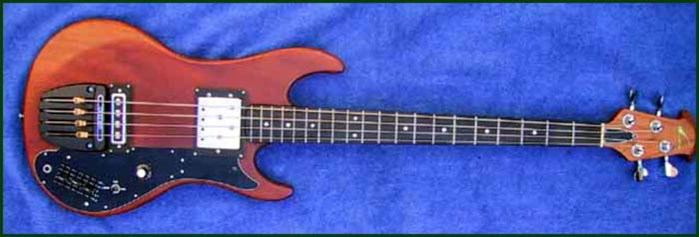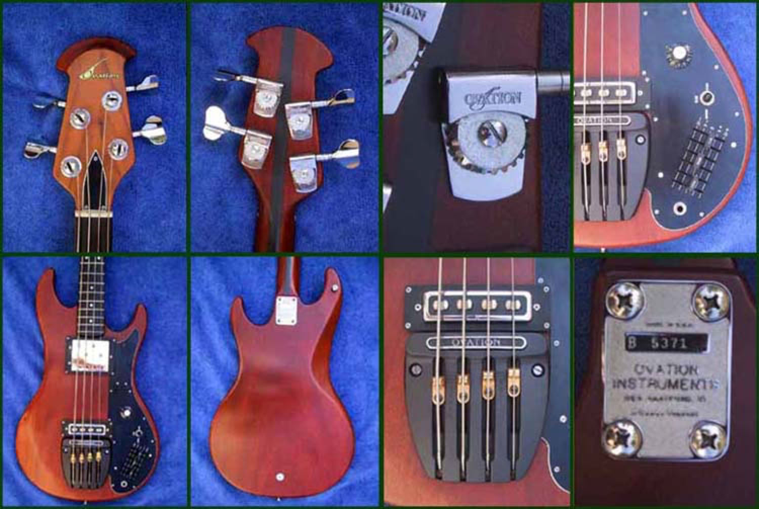 The Magnum was Ovations first solidbody bass. 'Solid' is an understatement. This is one of the heaviest basses I've ever played. But if you've got a strong back, this instrument will reward you with some awesome performance. The body is solid Honduras mahogany and the neck is mahogany reinforced with three graphite strips. The example shown below is the Magnum IV. This is a long scale 34" bass with an interesting active electronics setup. The massive neck pickup is a 4 pole humbucker and an added double pole bridge pickup. A three way toggle selects the pickups and there is a master volume control. Tone control is handled by a three band graphic EQ with +/- 12 dB adjustment for bass, midrange and treble. All hardware is chrome plated Schaller with semi-open gear tuners. The Magnum III is similar, except has individual pickup volume and tone knobs instead of the graphic EQ.