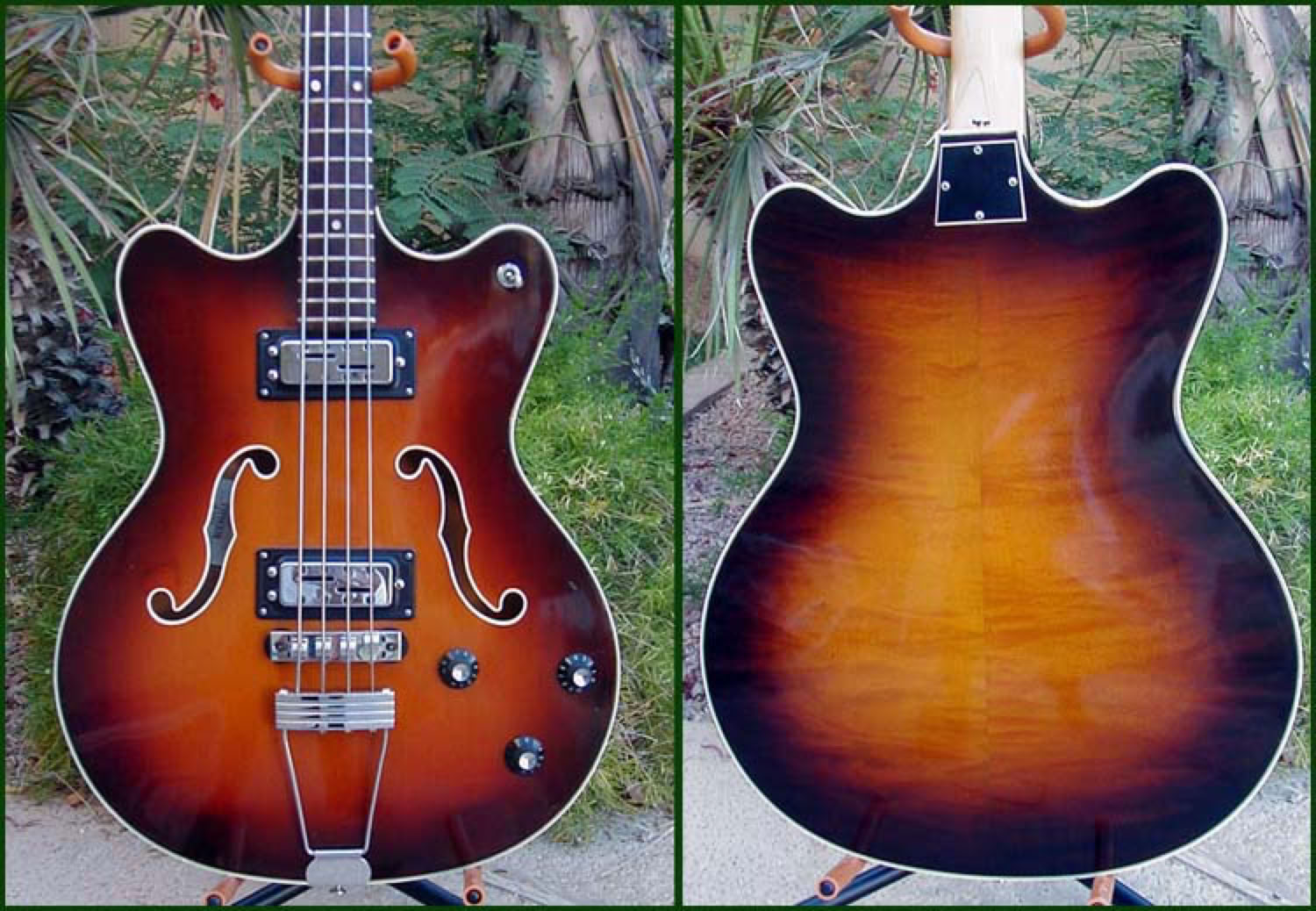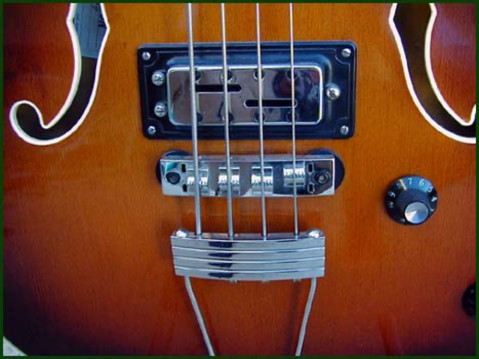 The Ovation line of semi-hollow body electrics guitars included several models of 4 string bass. The original model was called the "Williwaw" and had 2 pickups. Shortly after, a single pickup version was introduced as the "Typhoon". After the first catalog was printed in 1967, the single pickup model was renamed Typhoon I, and the 2 pickup version was renamed Typhoon II. The sunburst Typhoon II pictured here is a 1968 model in near-mint condition. The 2 pickups are controlled by a master volume control and two individual tone controls. The usual 3-way selector switch (neck, both, bridge) is located on the lower horn. The body of the Typhoon II is smaller and thinner than the 6- and 12-string electric storm guitars. The top is spruce and the back/sides are maple. The sunburst finish, multiply top binding and the nicely bound f-holes are all very nicely done.