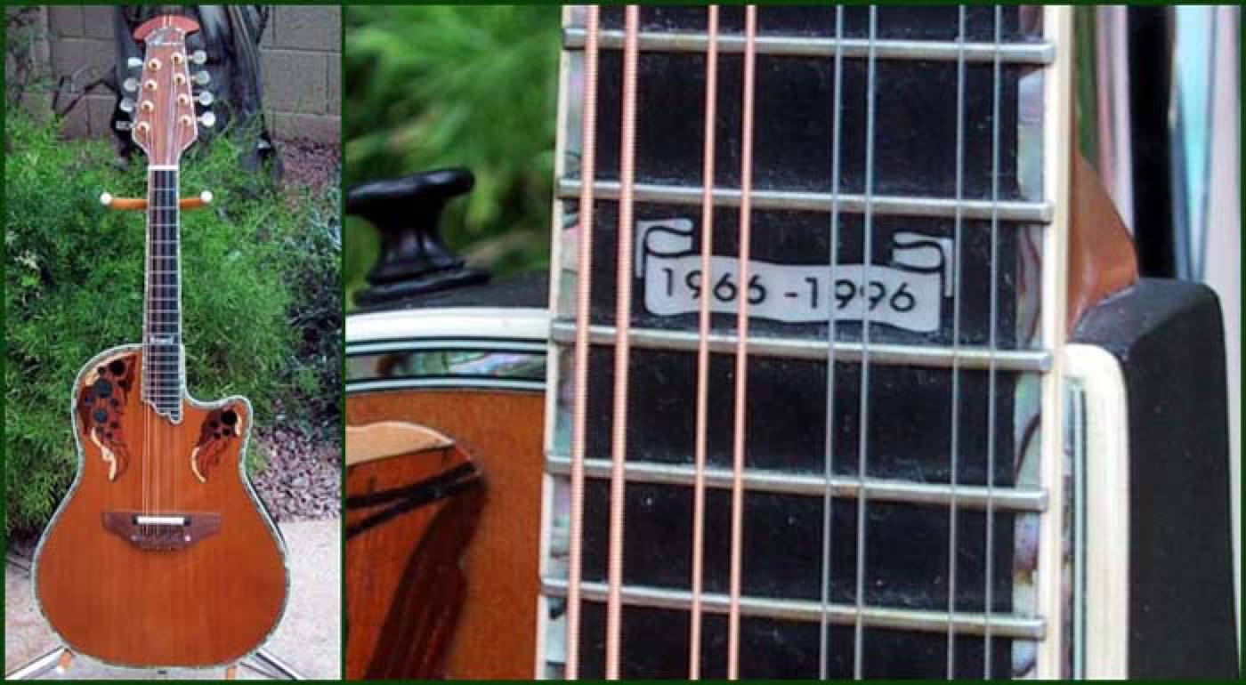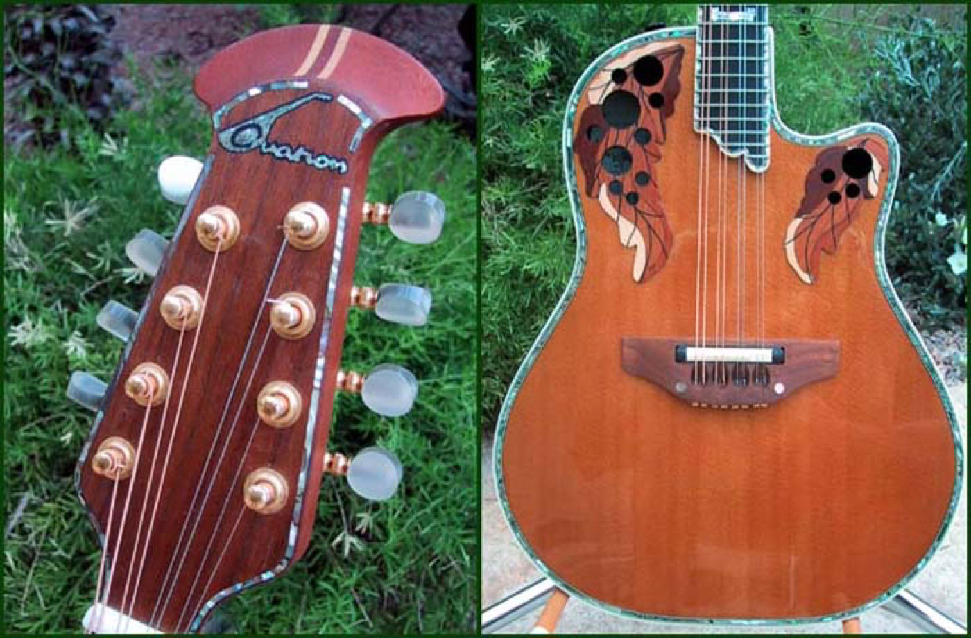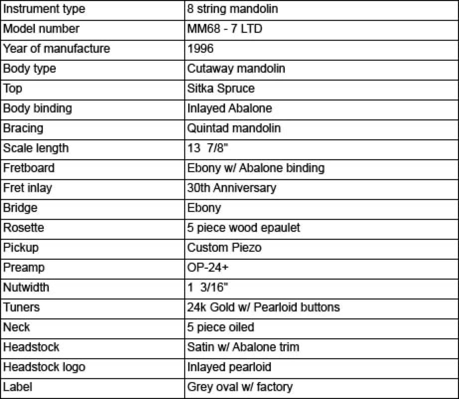 Officially it's a 1996 model MM68-7LTD mandolin. But for all practical purposes it's called the Ovation "Book" Mandolin, manufactured to celebrate Ovations 30th anniversary. It is the matching mandolin mate to the "Book" Elite featured on the cover of the Walter Carter book. The solid spruce top is finished with a honey toned ager and the entire body, neck, and headstock is lined in several hundreds of beautiful Abalone inlay. 24k gold tuners with pearloid buttons and an OP-24+ preamp system round out the configuration. The only fretboard marking is the exquisite inlayed "1966-1996" at the 12th fret. There does not seem to be an official count of how many were made. I've heard estimates of approximately 25. In my opinion this certainly is the most beautiful mandolin Ovation has ever produced.