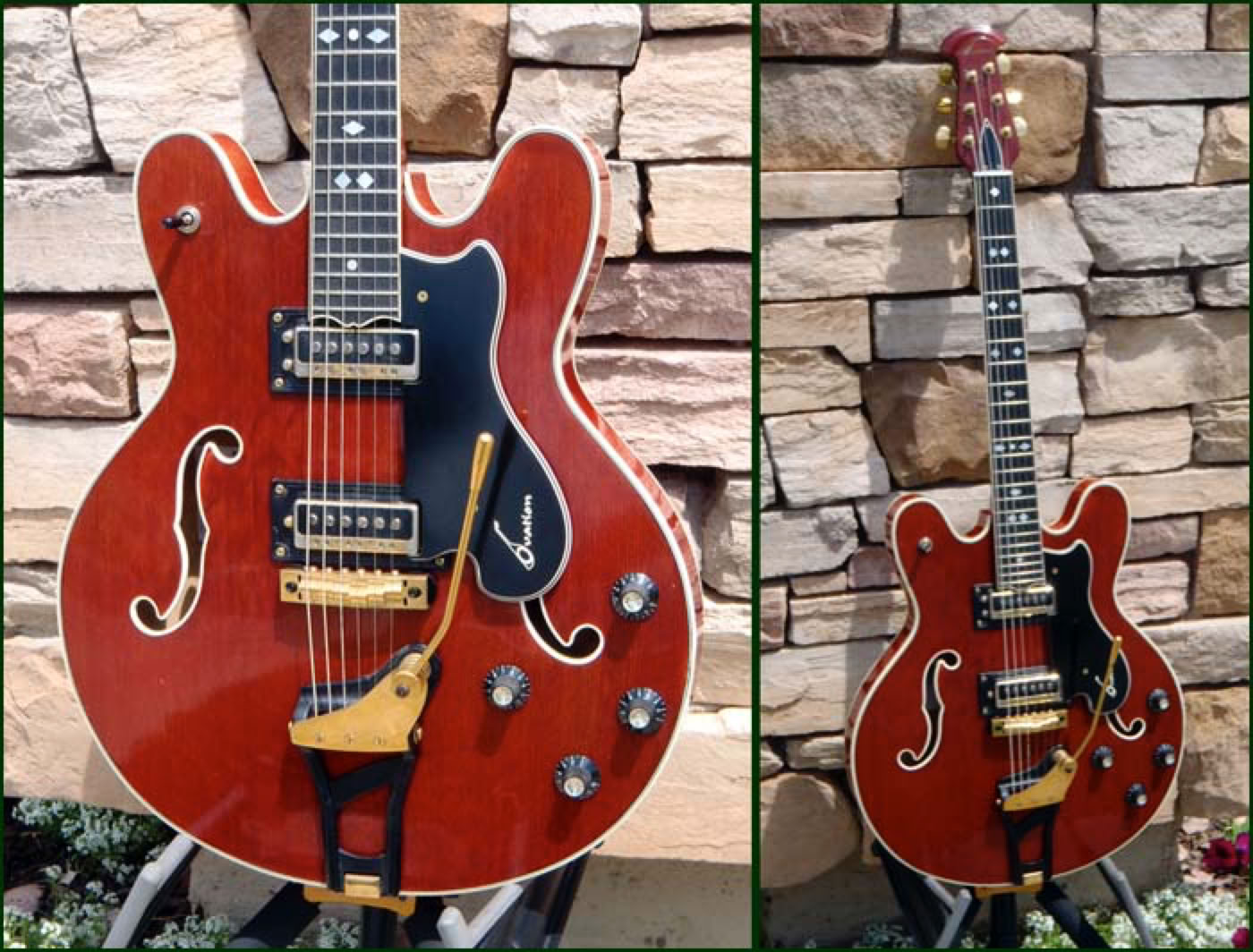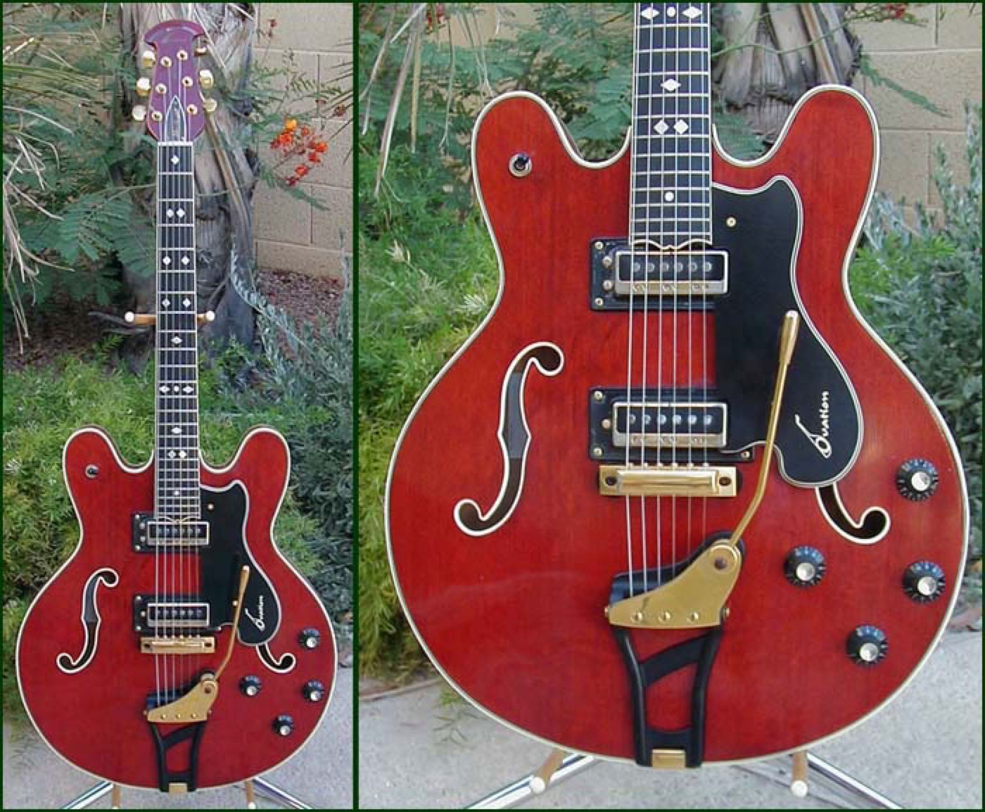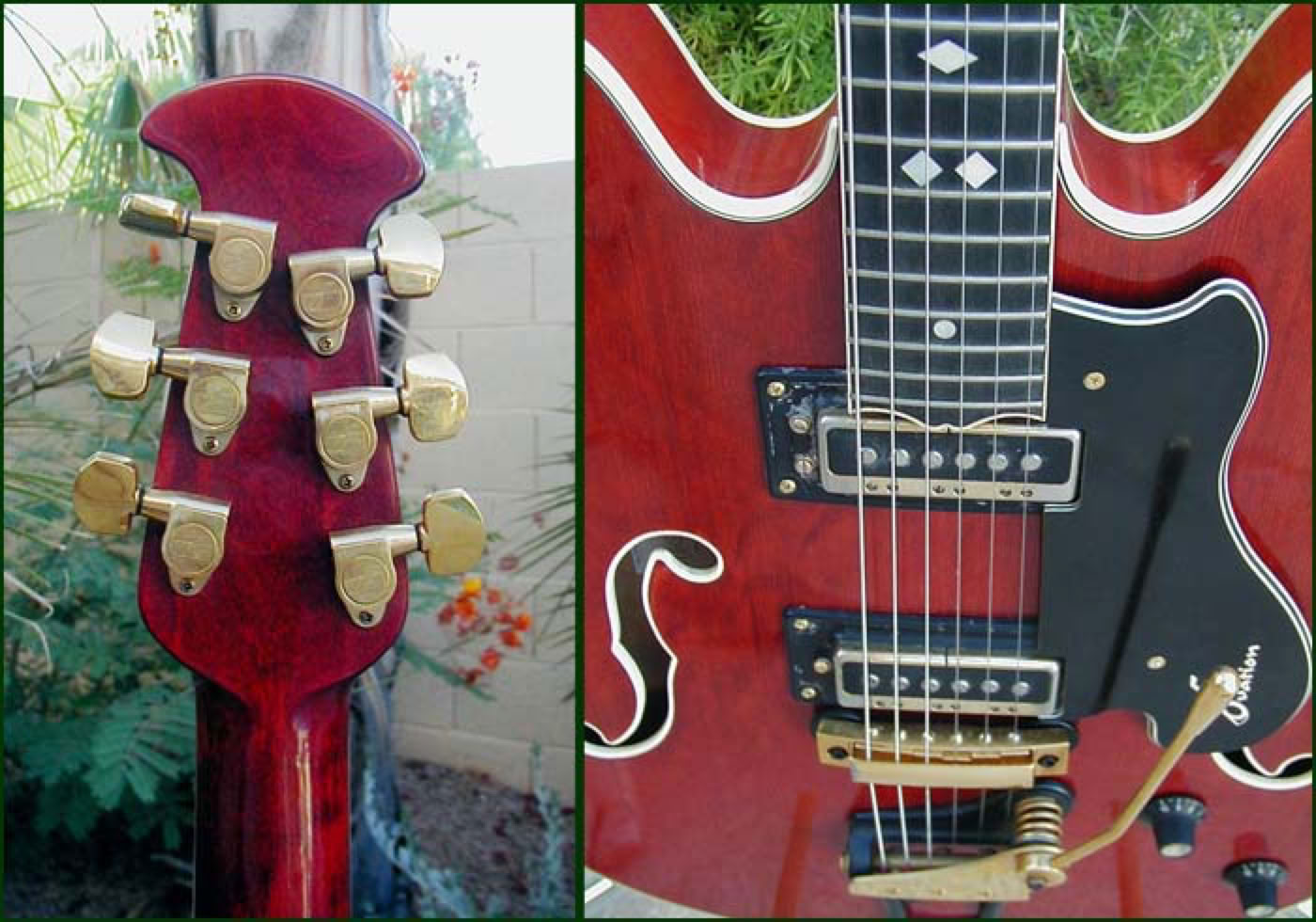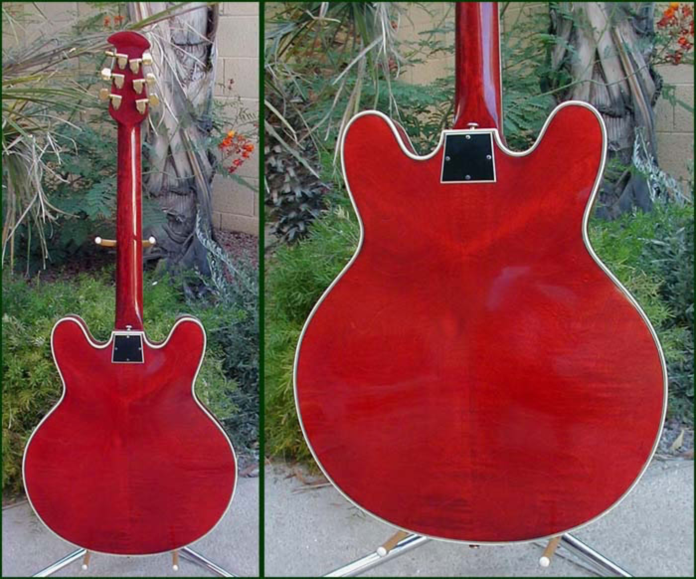 The wine-red finish is perhaps my favorite looking Storm Series guitar. Shown below is a Deluxe Thunderhead model with vibrato tailpiece. The maple and spruce body is beautifully figured and treated in a semi-transparent finish. The color is actually quite a bit more red than it looks in these pictures. There are no finish cracks or any signs of age at all on this 37 year old guitar. Hardware consists of gold Schaller tuners and 6-way adjustable bridge. The electronics are the standard Thunderhead setup with twin DeArmond gold pickups, master volume, twin tone controls and a pickup blend control. The 3-way toggle controls in and out of phase selection for the pickups. Perhaps the best part of this Thunderhead is the wonderfully fast neck bound in white ivoroid and adorned with diamond shaped inlays. This is the finest condition Thunderhead in my entire collection.