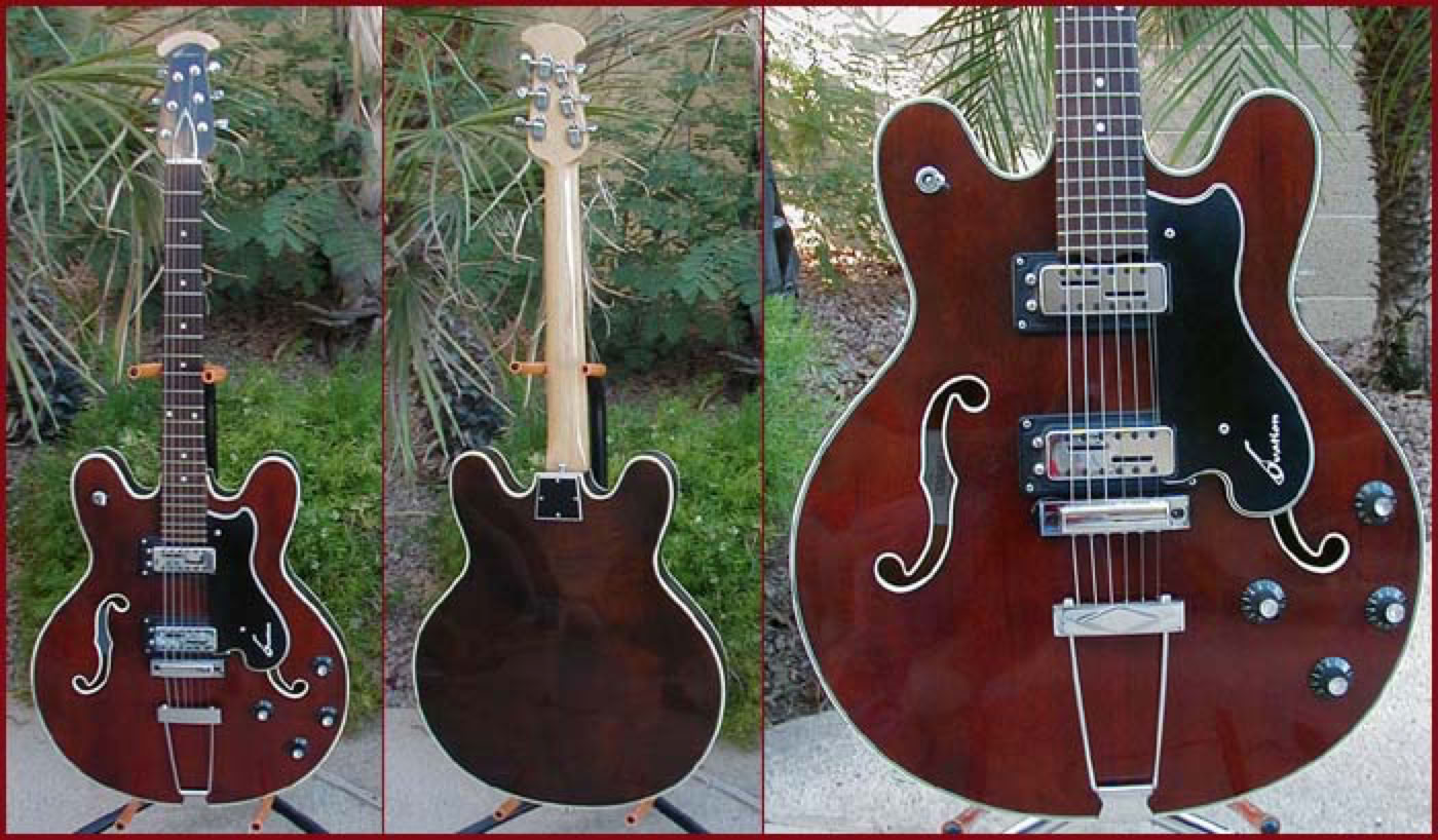Shown below is the most mint condition Storm series guitar I have ever seen. This 36 year old beauty could hang in a shop today as new. This is the Tornado model from early 1969. Placed in the lineup just below the more popular Thunderhead, the Tornado shared the same basic design and in fact had an identical body. The neck is blonde maple finish with an ebony unbound fingerboard. Chrome Schaller hardware includes the 6-way adjustable bridge and saddle as well as the stylish trapeze tailpiece. The same model was also available with a spring vibrato tailpiece for a slightly higher list price. The electronics consist of two high-output Schaller pickups wired to twin Volume and Tone controls and a 3-way toggle selector. The tuners are chrome enclosed Kluson Deluxe.
