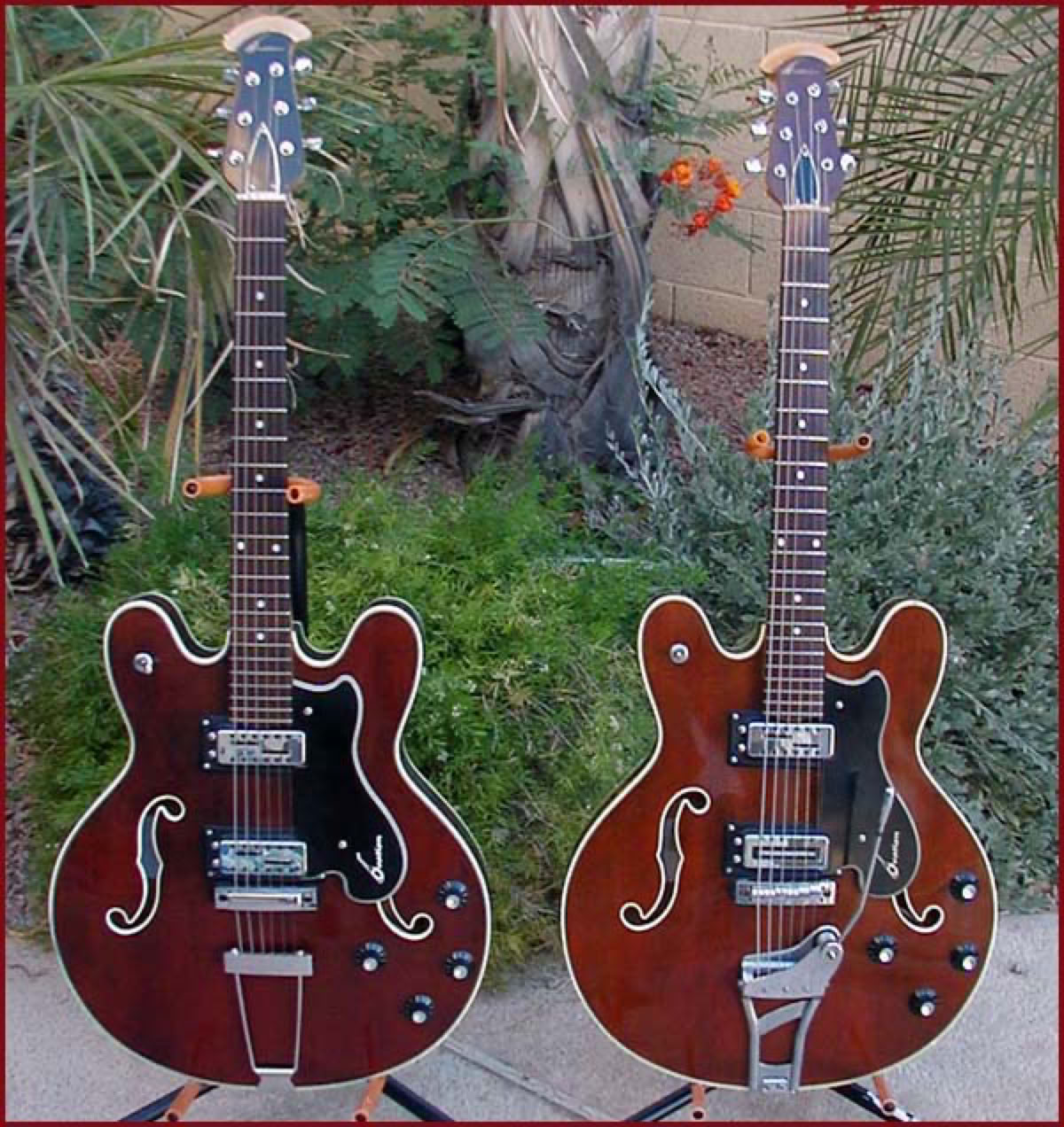 The Storm series of semi-hollow body electrics from the late 1960's included the Tornado model. Placed in the lineup just below the more popular Thunderhead, the Tornado shared the same basic design and in fact had an identical body. The neck was blonde maple finish with an ebony unbound fingerboard. Chrome Schaller hardware included a spring based vibrato tailpiece. The same model was also available without the vibrato. Electronics consisted of two high-output Schaller pickups wired to twin Volume and Tone controls and a 3-way toggle selector. This particular model show below has one 1st generation pickup (neck) and one 2nd generation pickup (bridge). The tuners are chrome enclosed Kluson Deluxe.