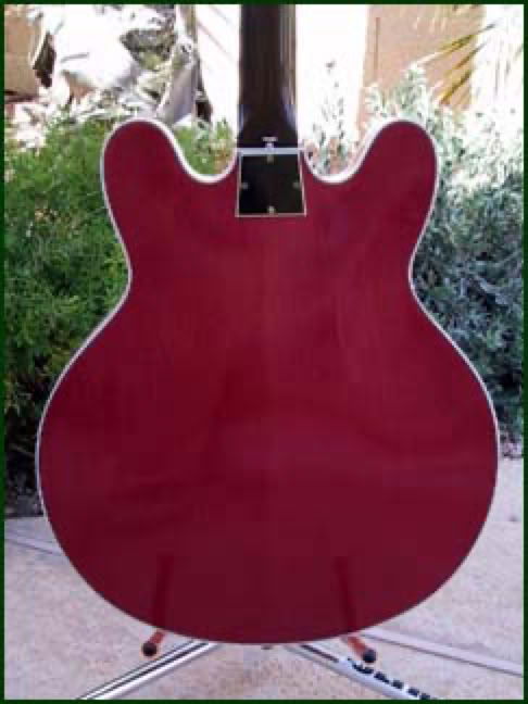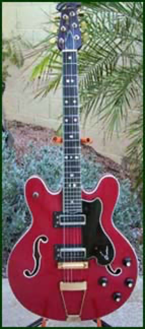 Shown here is a 1969 Thunderhead Deluxe in red finish. All thunderheads featured dual DeArmond pickups wired with individual tone controls and a master volume control. The balance of neck/bridge pickup volume is handled with a balance control. The three-position toggle includes an out-of-phase setting in addition to the usual off and normal positions.